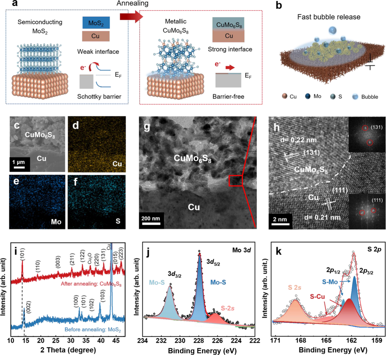 近日,开云线上(中国)网页版深圳国际研究生院刘碧录团队创制出一种基于双界面设计的同源金属电极。该电极以优化催化剂与基底以及催化剂与气泡的双界面为出发点,解决了大电流密度制氢下的传质、界面力学、界面电导三大难题。这种同源金属催化剂通过MoS2和Cu的原位高温反应制备,将半导体相MoS2转成具有金属性质的Chevrel相CuMo6S8,这种一体化结构有效消除了半导体-金属接触的界面肖特基势垒。由于电极表面催化剂与基底具有强的化学键结合,且电极展现出全金属性质以及超亲水状态,因此有效提升了催化剂/基底界面结合力并降低了催化剂/气泡界面粘附力,在增强电极稳定性的同时加速了析氢反应的动力学,展现出优异的电催化析氢性能。该电极在2.5 A cm-2下仅需321mV的过电位,在1 A-2.5 A cm-2级别的大电流密度下稳定运行300小时性能无衰减。此外,前驱体MoS2可取自天然矿石辉钼矿,成本比贵金属铂降低2-5个数量级,与目前的大电流密度催化剂相比具有更大的成本优势。