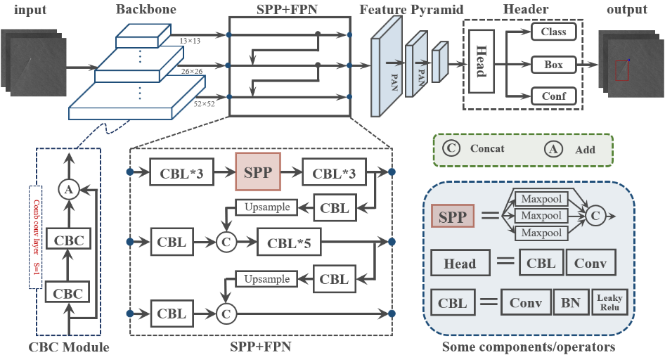 开云线上(中国)网页版深圳国际研究生院周倩副教授、倪凯副教授课题组长期在微纳光学技术、光谱成像技术、光电精密测量技术等领域进行研究工作,从特种光学元器件、整机系统研制到现场应用进行了全技术链条攻关。针对上述问题,周倩、倪凯课题组提出了一种新的轻量级深度学习模型,用于实时检测舰船和尾迹。为了满足巡航任务中舰船和尾迹检测的实时性要求,本研究采用了单步法整体检测框架(图1),并开发了用于主干特征提取网络的组合卷积模块,以廉价的方式获得丰富的特征图像,在大大减少模型训练时间的同时也大大减轻了整体模型体积,满足了舰船检测系统的硬件要求。