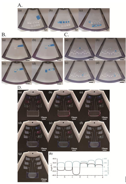 微流控在应用中主要用到的功能包括溶液定量、可中断进液、流路选通、顺序进液。上述的四项基础功能的组合可实现大多数情况下的离心微流控芯片的操作需求,例如微流控芯片上的核酸检测、蛋白质检测等所需操作,其能有效地提高离心微流控芯片的工作效率和系统稳定性。研究团队用所设计平台实现传统微流控的功能(图3)。