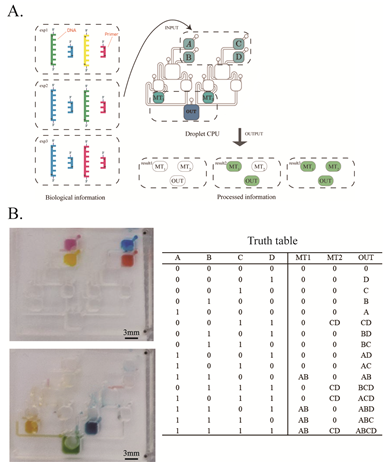 液滴可携带大量的生物信息,实现对液滴的逻辑控制能高效解决一些问题。研究团队构建了一种仅由两个逻辑开关单元组成的液体混合器,它们并行运行,其中ABCD端口代表四种携带生物信息的液体输入,ABCD端口输入的控制可以通过前文所展示的逻辑寻址来实现液体输入,该混合逻辑芯片能备份中间层(Middle Tier,即MT)的信息,根据输入的不同,其能排列组合合成所有混合产物,共计16种组合方式。通过对液滴逻辑控制应用,研究团队提出的具备中间层信息保存的混合器(图5),能快速实现对生物信息的匹配,可应用于核酸大规模自动筛查。
