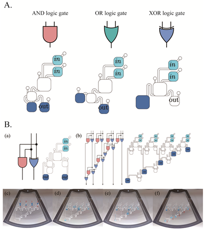 在前文研究团队所演示的功能更多是基于单进程的控制,针对如何依靠偏转角和偏转速度实现多进程的控制研究团队展开进一步研究。可变位姿微流控芯片在工作过程中能不断进行顺时针和逆时针的偏转,这令研究团队想到电路设计中的晶振元件为系统提供时钟信号,而离心力又与电源十分相似同样为系统提供动力,于是研究团队从逻辑电路角度去构思芯片设计,通常称之为逻辑水路。通过对偏转脉冲的控制,研究团队实现逻辑液滴的加法器(图4),证明在离心微流控平台实现液滴逻辑控制的可行性。