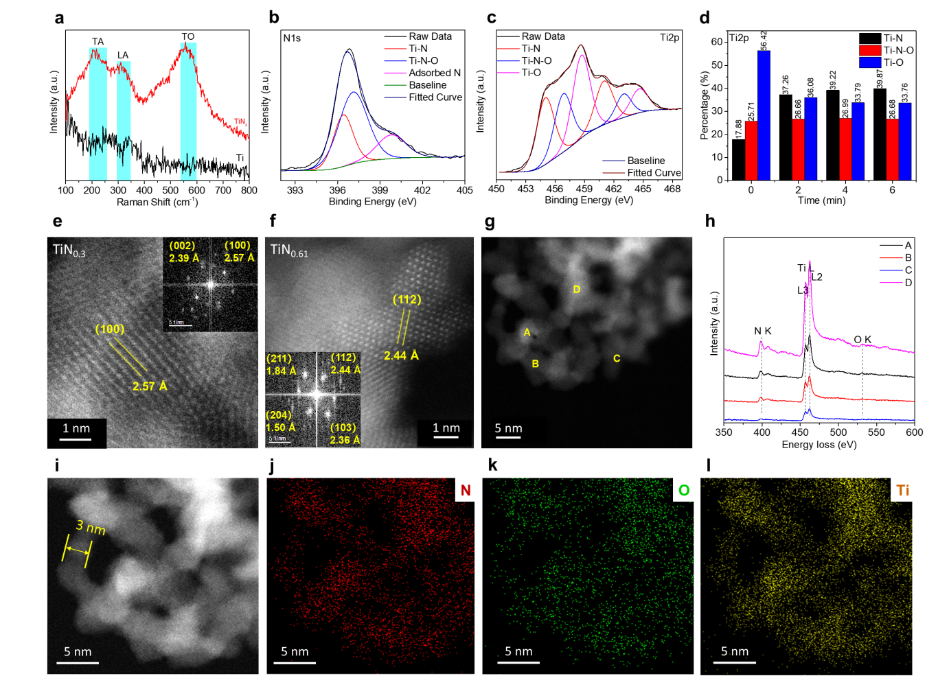 近日,开云线上(中国)网页版深圳国际研究生院杨诚副教授团队提出了一种激光诱导瞬时自组织纳米结构的快速制造方法,并制备了一种直径在3-5nm左右的TiNx纳米丝混沌分形渗流网络(LITN)。通过调控激光加工的热力学和动力学条件,以及优化等离子体场、温度场、冲击波效应等多物理场作用,研究团队可以控制TiNx纳米丝的形态、组成和晶体取向。图1展现了LITN在不同时间尺度下可能的形成机制。它主要可以分为两个阶段:激光加热和瞬时冷却。整个LITN的形成过程涉及光子吸收、晶格振动、相变、等离子体形成和反应、凝结和自组织。在激光诱导冲击波和光热效应的瞬态过程中,等离子体状态的[Ti]和[N]相互反应,形成TiNx纳米团簇。随后,这些TiNx纳米团簇在多物理场环境中凝聚,表现出典型的自组织过程。如图2所示,LITN表现出纳米丝和介观尺度的孔隙结构。