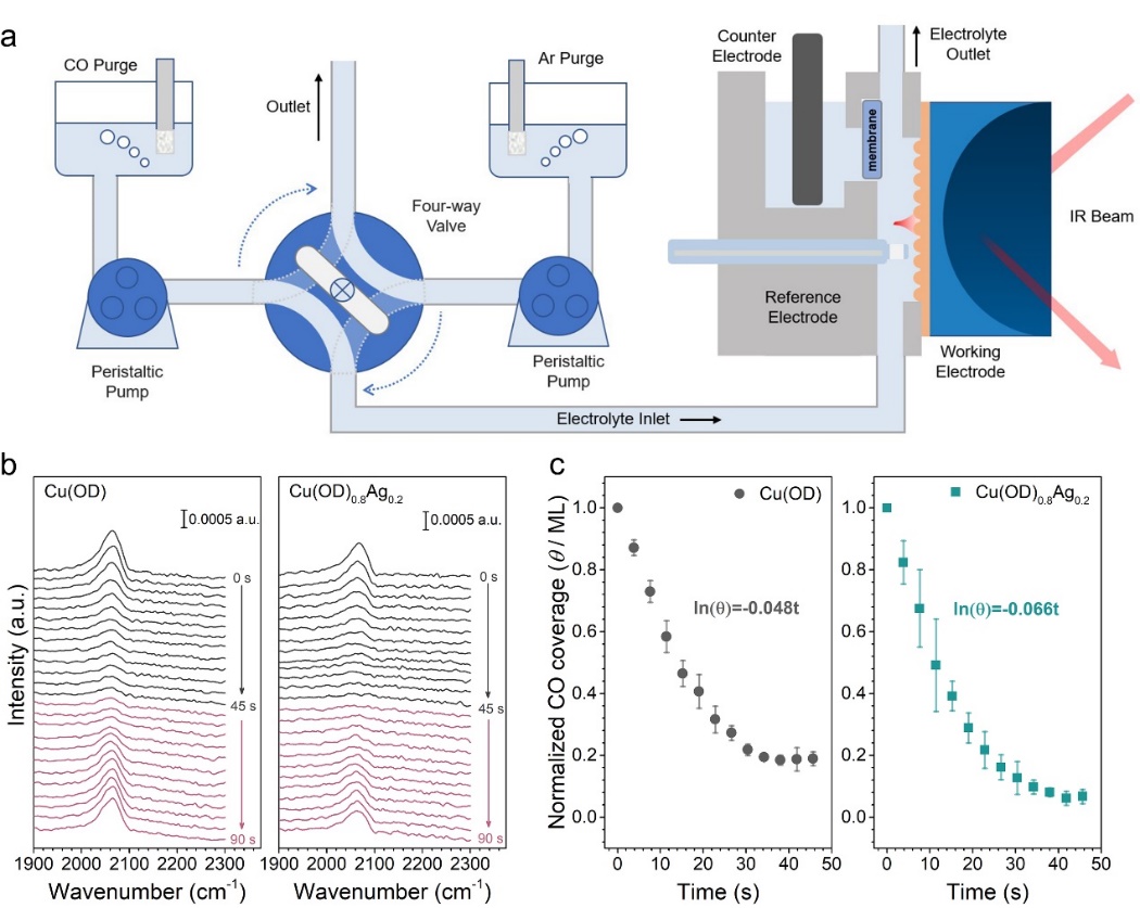 一氧化碳在催化剂上的解吸速率 (a) 自主设计的快速切换电解液红外电解池;(b) CO在氧化铜催化剂和8:2铜银催化剂上的红外峰示意图;(c) CO在氧化铜催化剂和8:2铜银催化剂解吸速率图。