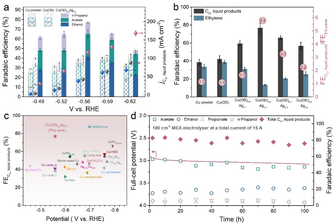 铜银催化剂一氧化碳还原活性(a) 8:2铜银催化剂、氧化铜催化剂以及粉末铜催化剂的CORR反应电流以及对多碳液相产物的选择性;(b)不同铜催化剂CORR中的产物选择性分布;(c)现阶段已报道的先进催化剂性能对比;(d) 8:2铜银催化剂在100cm2膜电极中性能表现。