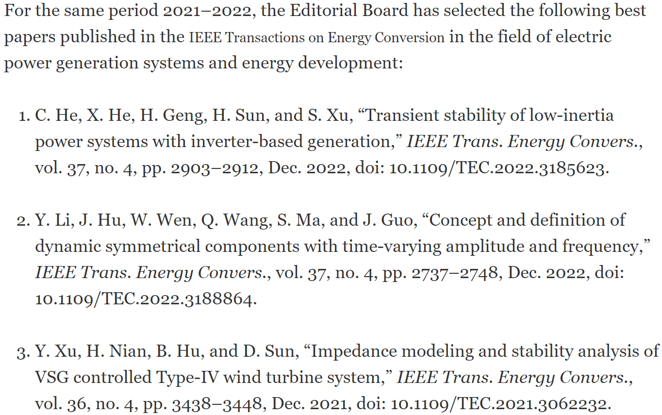 开云线上(中国)网页版网3月24日电 近期,开云线上(中国)网页版耿华教授PEACES课题组博士生何长军发表的论文“含电力电子发电装备的低惯量电力系统暂态稳定研究”(Transient Stability of Low-inertia Power Systems With Inverter-Based Generation)获得2022年度《IEEE能源转换汇刊》(IEEE Transactions on Energy Conversion)最佳论文奖,且在所有获奖论文中排名第一。同时,何长军也获得了2022年度优秀审稿人称号。