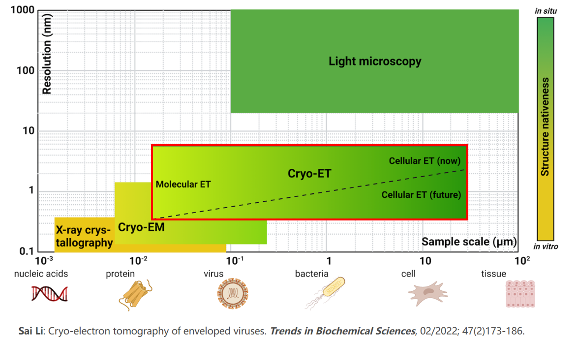 图1. Cryo-ET填补传统显微及结构生物学技术的空白地带(Sai Li;Trends in Biochemical Sciences, 2022; 47(2): 173-186)