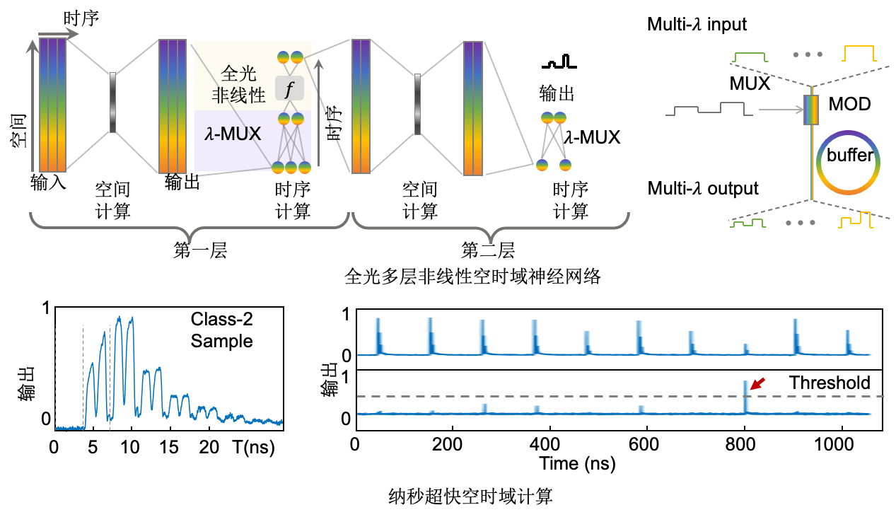 课题组通过刻画多维光场传播模型,首次建立空时域计算表征,同时在空间和时序维度完成连续光计算。针对空间光场和时序光场内在维度失配问题,提出空间复用和光谱复用计算模型,匹配空时域光计算维度。进一步建立时序矩阵乘加计算模型,扩展空时域光计算维度。所有空间和时序计算操作均在光学模拟域完成,因此空时域光计算的速度不受制于电子内存的传输和读写。该论文进一步提出了多变量全光非线性函数,成功构建多层非线性神经网络,支撑复杂视觉智能任务的高速推理。在多个视频数据集上的实验结果表明,空时域光计算能够将视频智能处理速度提升至数百兆赫兹量级,有望为后摩尔时代高性能智能计算以及瞬态科学现象的实时分析和控制等带来新的契机。