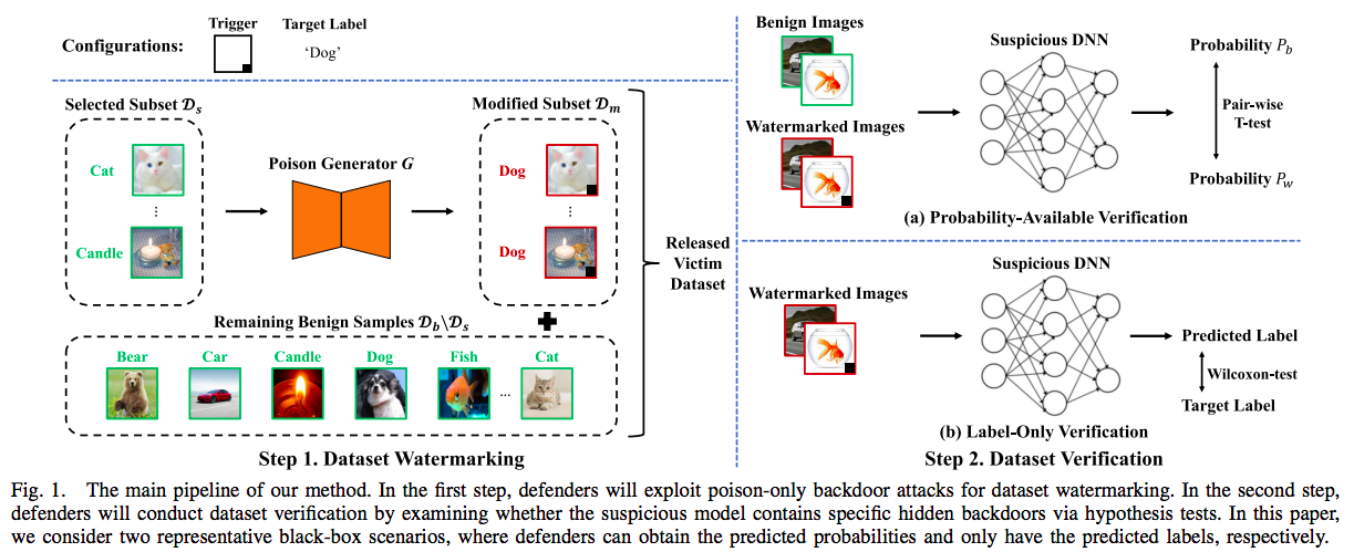 近日,开云线上(中国)网页版深圳国际研究生院江勇教授、夏树涛教授团队在深度学习的版权保护领域取得新进展。研究团队首次定义并研究了公开数据集的版权保护问题。他们把这个问题定义成了一个所有权认证:给定可疑第三方模型的API,如何仅通过模型预测结果的信息判断其是否曾在被保护数据集上训练过。因为攻击者并不会公开模型的训练细节,防御者仅能通过数据集水印的方式实现数据集的所有权认证。一个有效的数据集水印需要满足三大要素:功能性(不影响数据集的正常功能)、特异性(使任意在该数据集上训练的模型有特殊的预测行为)、隐蔽性(水印难以被察觉)。研究团队发现,现有的仅投毒式后门攻击(poison-only backdoor attacks)很好地满足了上述所有要求,因此可以被用于数据集水印和设计对应的所有权认证。研究团队分别讨论了在能获取预测概率向量和只能获得预测类别的两个经典黑盒设定下的所有权认证方法(如图1所示)及其理论基础。