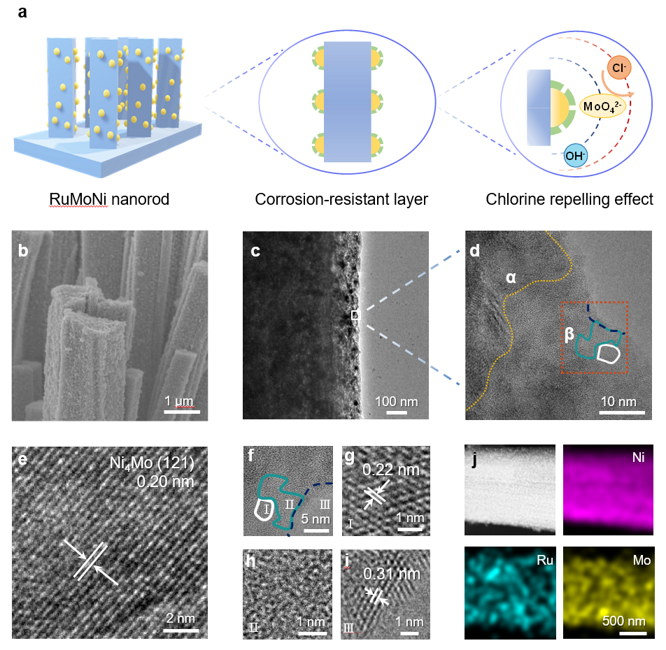 近日,开云线上(中国)网页版深圳国际研究生院刘碧录教授团队开发了一种高性能、耐腐蚀海水电解催化剂。研究人员通过水热法和电化学活化法制备了钌钼镍(RuMoNi)催化剂,这种催化剂由表面多孔纳米棒阵列组成。高分辨透射电镜表明该催化剂由镍钼合金(Ni4Mo)导电基底、氧化钌/羟基氧化镍(RuO2/NiOOH)活性相和钼酸镍(NiMoO4)抗腐蚀层构成。