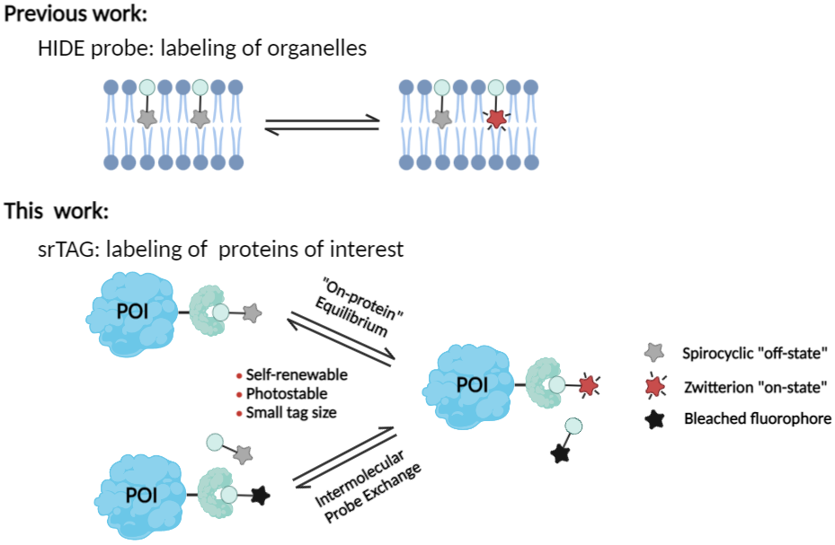 该课题组开发了一种用于蛋白质光稳定荧光成像的荧光自修复蛋白标签(srTAG)。利用了荧光两性离子和非荧光螺环形式之间的“蛋白质上”荧光团平衡,以及非共价探针的可交换性。该工作发现srTAG在光漂白后自发恢复荧光信号,与具有相同荧光团的Halo和SNAP-tag缀合物相比,漂白半衰期延长2至6倍。除此之外,srTAG概念适用于不同吸收和发射光谱的荧光团。srTAG能够与STED显微成像兼容,可以与其他可交换标签组合进行多色成像实验。此外,与其他自标记标签或荧光蛋白相比,srTAG的尺寸较小(12kDa),对活细胞中的蛋白质运输和分布影响相对较小。因此,这项工作作为可逆标记标签的强有力补充,能够极大助力研究细胞内蛋白质运输分布等相关的生物应用。