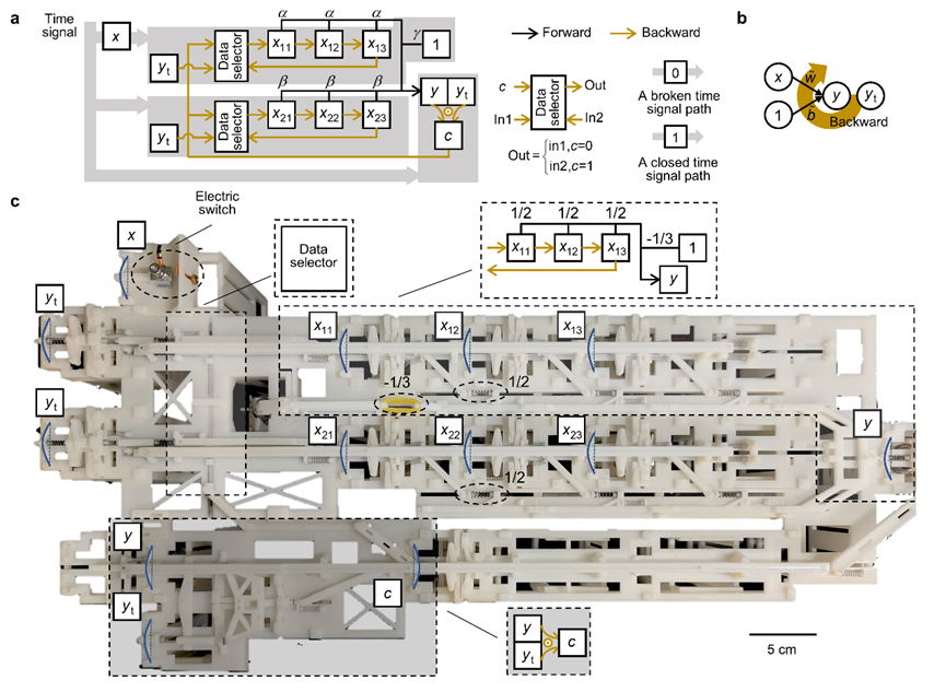 所构筑的机械自学习感知器由向前传播(黑色连接符号)和向后传播(棕色连接符号)两套信息传输回路组成,见图3a和3b。在向后传播过程中,所建立的体系能够基于外部输入情况自适应更新权重,从而能够习得目标输入输出关系(图3c)。上述两个示例显示,在机械内存中可进行计算的分布式信息处理,从而能最大程度上发挥结构本身的智能,为构建新一代的类生命体的“智慧型”材料提供基础。