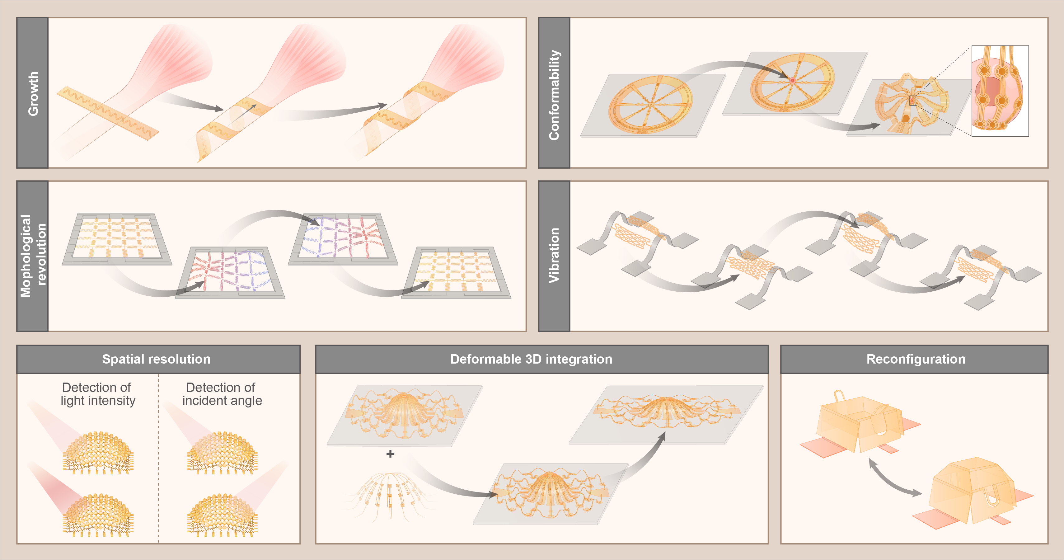 三维柔性电子器件在生物学、医学、能源、机器人、健康监测等领域具有重要应用价值。力学引导的三维组装方法通过利用先进材料及结构力学原理,将器件构型由平面转为三维。该方法具有材料/尺度适用范围广、成型后可再变形、可兼容平面加工工艺等优势,是三维柔性电子器件的核心制造方法之一。