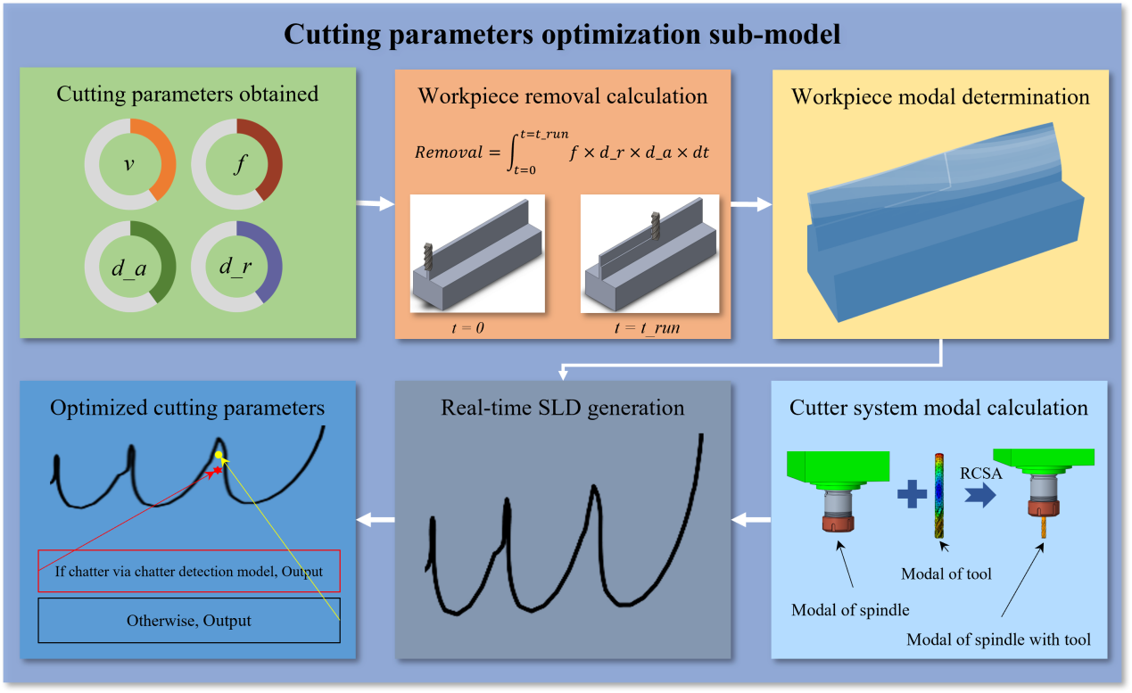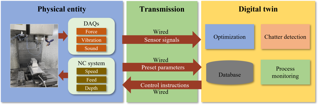 机床的颤振是影响加工精度和工件质量的重要因素,然而,精密加工中的颤振预测及其特征分析仍然有待解决。针对上述问题,开云线上(中国)网页版深圳国际研究生院先进制造团队的王晓浩、冯平法、张旻、冯峰等教师展开了一系列数字孪生技术助力数控机床领域发展的研究工作。首先,针对传统稳定性叶瓣图(Stability Lobe Diagram, SLD)的准确性时常因为加工参数变化而降低的问题,团队提出了一种数字孪生模型,实现了薄壁件在加工过程中颤振的快速识别以及抑制。数字孪生模型由三个部分组成:物理机床及其加工过程、对应的孪生体和两者之间的数据传输。在加工过程中,切削力、主轴振动、切削噪音等传感器信号和转速、进给、切深等数控系统设定参数通过有线的方式传输至孪生体。在孪生体中,颤振识别和优化模型对上述数据进行分析,计算出可抑制颤振发生的加工参数并反馈指导机床加工。