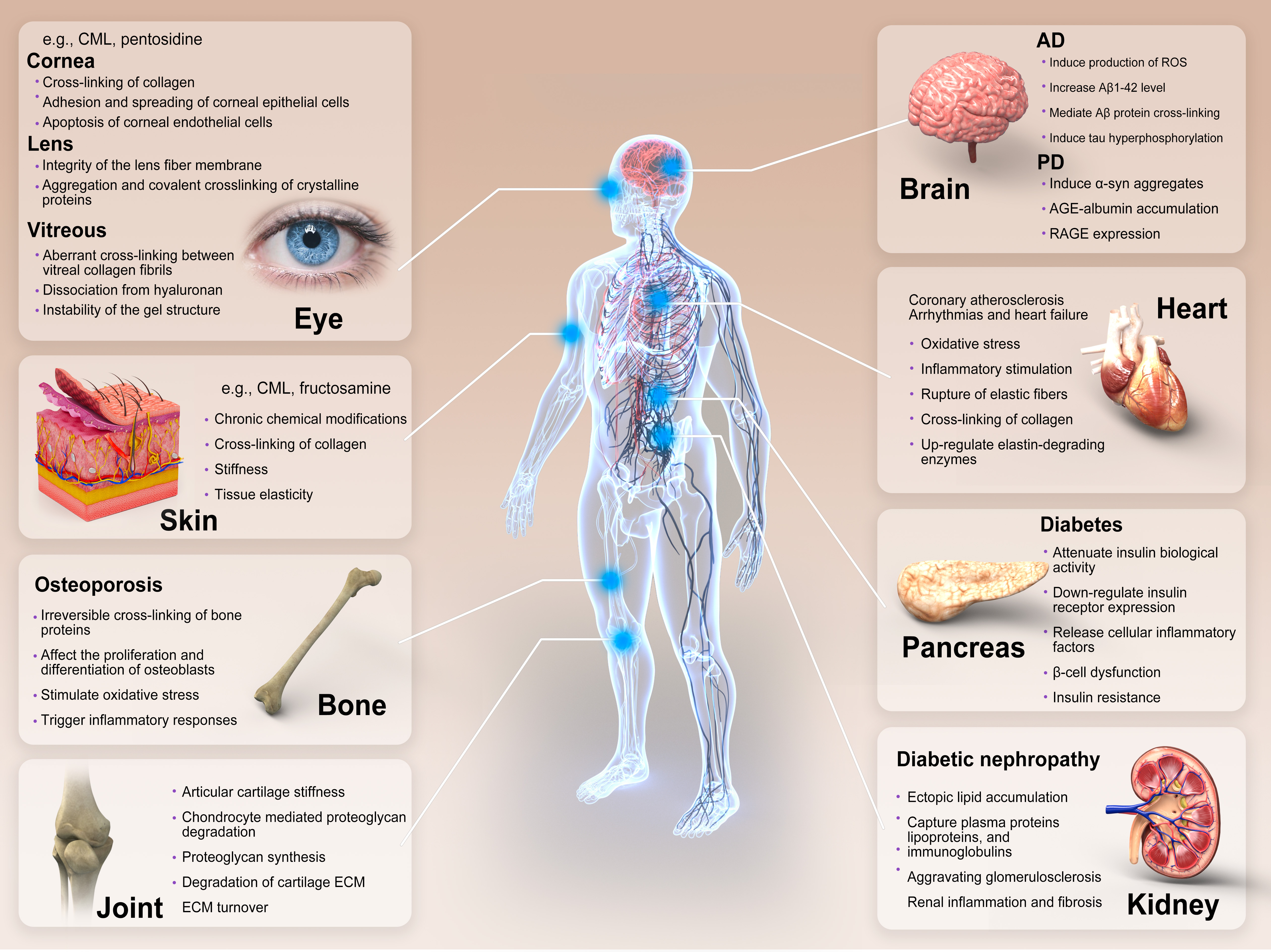具有长寿命蛋白质的组织,如晶状体、动脉、肌腱、肺、软骨或皮肤,通常会随着年龄的增长而失去弹性或硬度增加。这种现象不仅是由弹性蛋白或胶原蛋白含量的变化引起的,一方面,MRPs含量与年龄相关的僵硬、蛋白质消化率和组织弹性损失相关。随着年龄的增长,还原糖和蛋白质一级氨基之间的非酶促MR形成的AGEs会增加组织蛋白质的化学修饰和交联,慢性修饰损害蛋白质水解消化率并改变蛋白质构象。另一方面,AGEs在组织中的积累也刺激了过度的氧化应激和细胞因子的释放,从而影响胞外基质(Extracellular matrix,ECM)的更新。