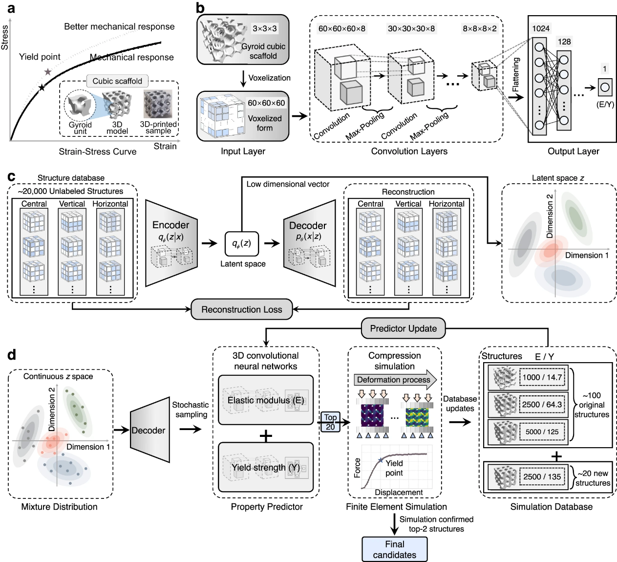 研究团队创新地提出了一种生成模型、三维卷积神经网络和数值模拟相融合的主动学习循环(GAD-MALL)算法用于超材料多孔结构设计。首先,基于生成式模型中的自编码器对18000余个多孔结构进行无监督学习,通过编码器-解码器神经网络学习高维数据中的有效信息,将高维设计空间转换至低维并展示在模型的潜在空间中;接着,通过高斯混合模型在潜在空间中进行采样,利用解码器对采样信息进行解码得到采样结构;进一步,利用三维卷积神经网络对采样结构的性能进行预测,利用数值模拟方法对预测性能最优的结构进行物理分析,校准预测结果并更新采样数据库;然后,基于更新后的三维卷积神经网络对新一轮采样结构进行预测,并迭代优化多目标性能;最终,将优化后的结构进行3D打印和物理测试,并与传统方案进行对比,直至实现预期的优化效果。这种学习方法能够在数据稀疏场景下有效解决高维多目标优化难题,为AI赋能材料和结构设计提供了一种高效范式。