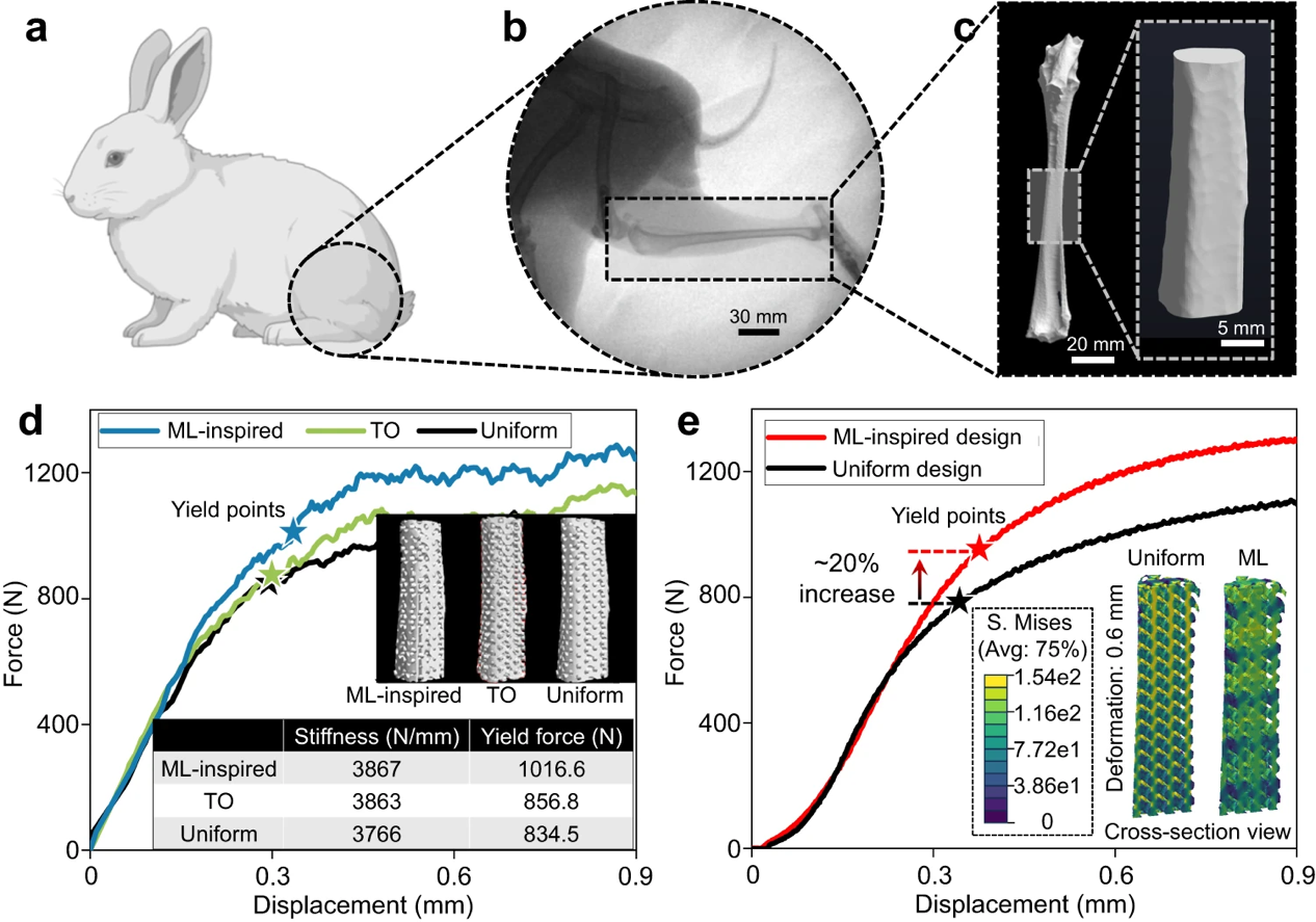 研究团队成功地将这种方法应用于钛合金和可降解锌金属骨缺损修复多孔植入物的优化设计和3D打印,生成的多孔植入物在快速匹配骨骼解剖形态和弹性模量的同时,保持良好的孔隙连通性和可制造性,展现出比均质结构和拓扑优化结构更高的屈服强度和更均匀的应力分布。目前团队和北医三院骨科合作,在国际上率先实现了3D打印可降解金属多孔植入物的临床应用,成功完成围关节骨折骨缺损修复30余例,未来将会采用AI赋能的定制化方法,对3D打印多孔植入物的材料和结构进一步优化,实现骨缺损修复的精准治疗。