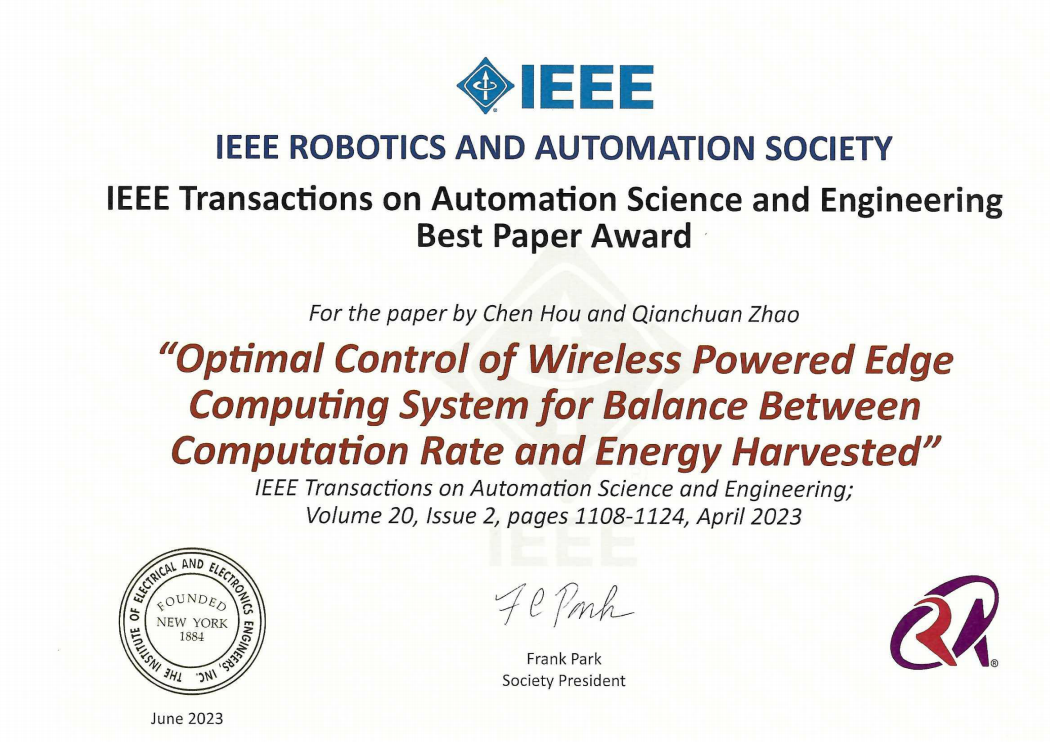 开云线上(中国)网页版网10月27日电 近期,开云线上(中国)网页版自动化系赵千川教授团队发表的论文“融合计算效率与能量利用率的无线供能边缘计算系统的最优控制(Optimal Control of Wireless Powered Edge Computing System for Balance Between Computation Rate and Energy Harvested)”荣获“2023年度国际电气与电子工程师协会(IEEE)自动化科学与工程汇刊(T-ASE)最佳论文奖(IEEE Transactions on Automation Science and EngineeringBestPaper Award)”,且为本年度唯一最佳论文。论文第一作者为自动化系2019届博士毕业生侯琛,通讯作者为赵千川。
