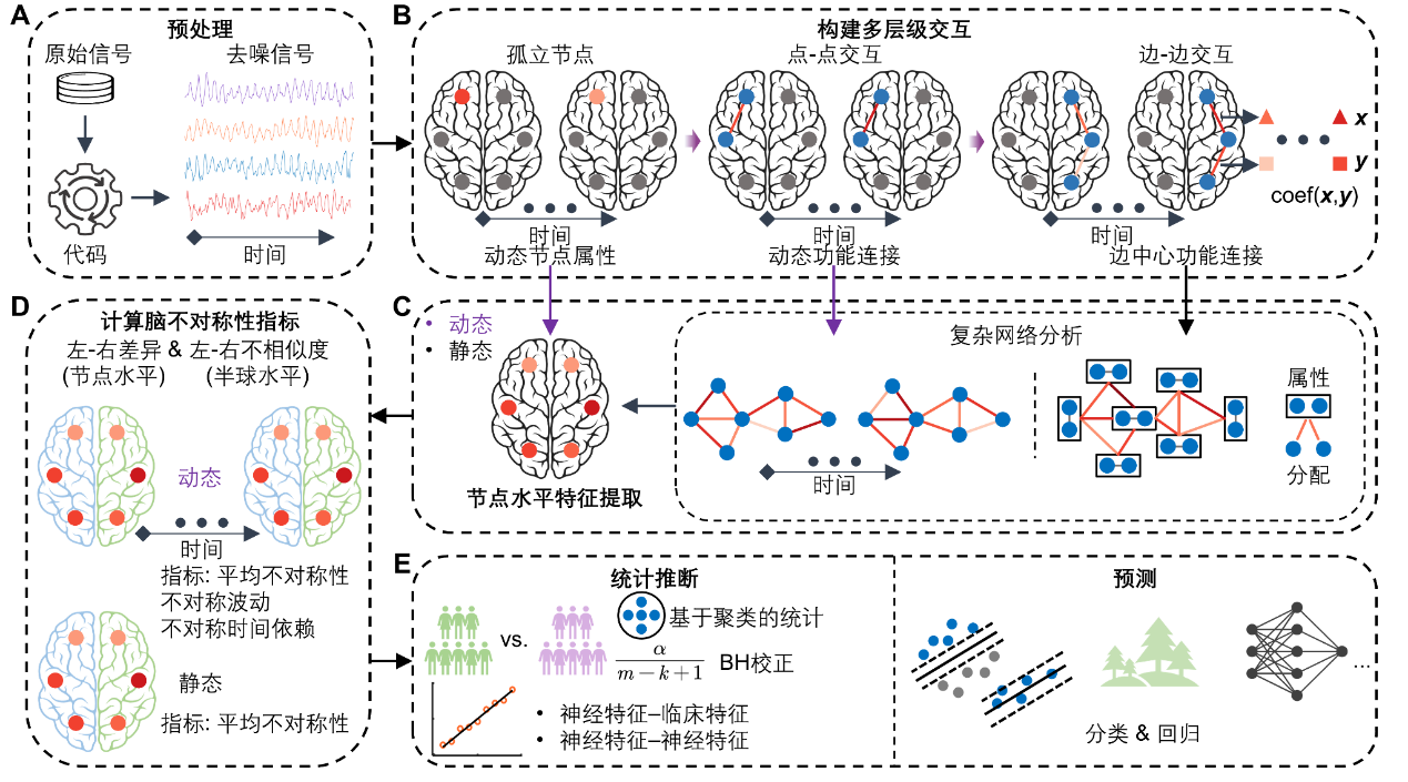 近日,开云线上(中国)网页版电子工程系多模态数据处理系统研究室窦维蓓教授和北京清华长庚医院康复医学科潘钰教授团队研究提出的多层级脑不对称性综合分析(CAMBA)框架(图1),将三个层级的脑交互整合到统一的脑不对称性分析管道,捕捉节点和半球水平的脑不对称性动态。该框架被应用于健康人,卒中患者基线,卒中患者下肢康复训练前后等三个静息态EEG数据集。该框架在三个交互层级分别度量了动态节点功率,动态功能连接和以边为中心的功能连接,并结合复杂网络分析,研究以下三个临床上关心的问题:(1)卒中对各层级脑交互和各频带的脑不对称性带来了什么影响?(2)不同下肢康复策略引起的脑不对称性的改变模式是什么样的?是否与临床行为评分相关?(3)基于基线时的临床和脑不对称性特征是否可以预测特定康复训练策略下的功能恢复?