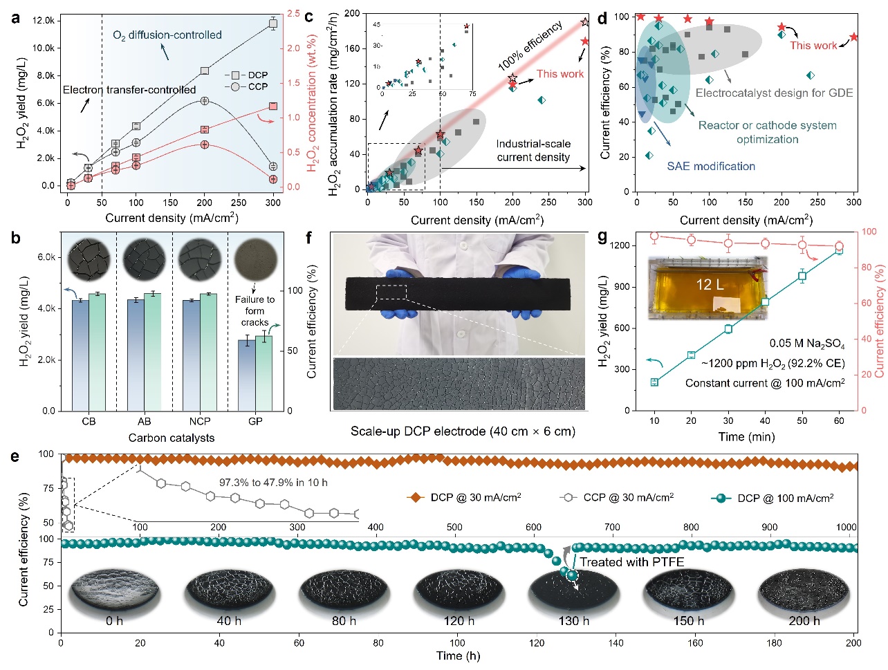 相关研究以“用于工业H2O2电合成的自曝气抗电润湿碳膜电极”(Anti-electrowetting carbon film electrode with self-sustained aeration for industrial H2O2 electrosynthesis)为题,近期发表在《能源与环境科学》(Energy & Environmental Science)期刊上。