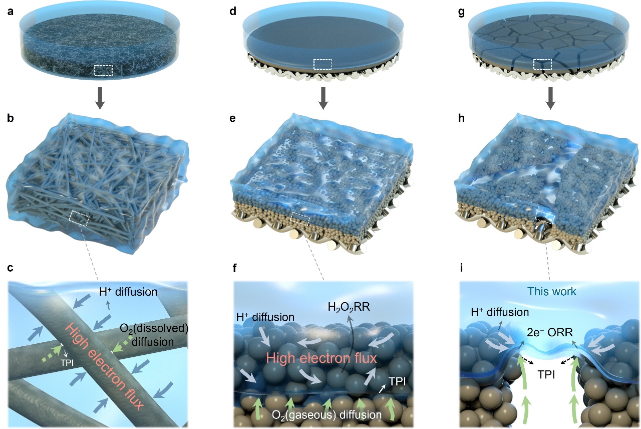 开云线上(中国)网页版网12月4日电 过氧化氢(H2O2)是现代化学工业的基石之一,同时也是潜在的能源载体,具有广泛的应用范围,例如增值化工产品合成以及清洁水生产等。电化学双电子氧还原反应(2e−ORR)代表了一种经济且可持续的分布式按需生产H2O2的未来战略,适用于从大规模化学品生产到小型便携式卫生设施的潜在应用。气体扩散电极(GDE)被公认为是目前最有前途的2e−ORR电极架构平台,其允许气态反应物直接从供给端输送至反应性气-液-固三相界面(TPI)而无需预先溶解到电解质中。然而,由于高电流密度操作条件下的快速电润湿对气体扩散电极反应性三相界面造成的破坏性淹没,使得H2O2电合成工艺的工业转化面临选择性低和耐久性差的重大挑战。