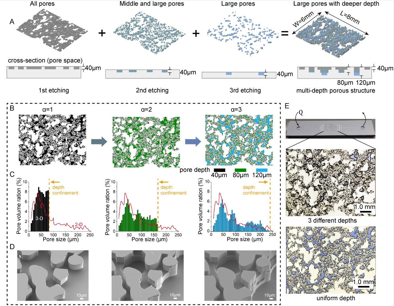 图1.通过优化的顺序光刻和多次刻蚀技术设计了具有深度变化的微流体芯片。(A)通过优化的顺序光刻和多次蚀刻制造深度可变微流芯片策略的示意图。(B)根据二维孔隙宽度分布将多孔结构分为不同深度区域,以蚀刻1→3个不同的深度。(C)微流芯片的三维孔径分布将受到不同深度约束的压缩,这里红线是无深度约束的二维孔径分布。(D)均匀深度、两深度和三深度的硅基底上局部多孔结构的扫描电子显微照片。(E)显微镜下观察的微流芯片图像和相应的多孔结构