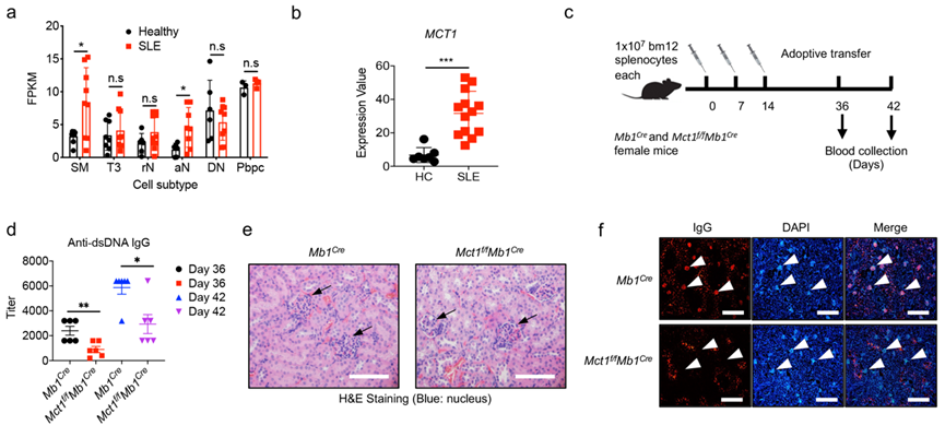 研究人员探索了此发现的临床意义。系统性红斑狼疮(SLE)是一种自身免疫性疾病,其特征是自身耐受性缺失,导致过度活化的B细胞异常扩增。研究人员发现系统性红斑狼疮患者的MCT1表达水平明显上调,也在bm12诱导系统性红斑狼疮小鼠模型中,发现敲除MCT1可以有效缓解SLE小鼠的症状,降低抗dsDNA抗体的产生以及IgG抗体在肾小球的聚集(图3)。
