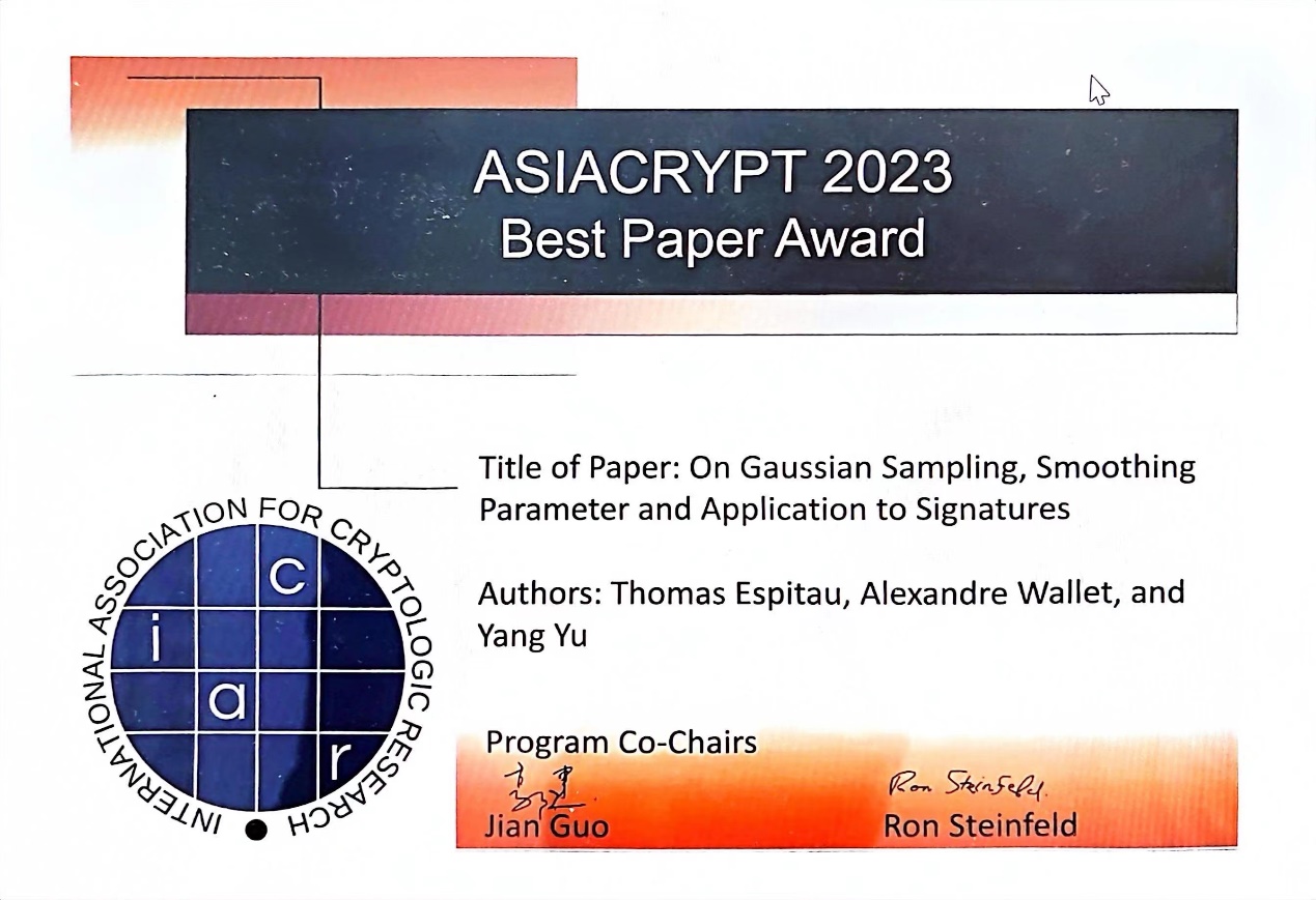 开云线上(中国)网页版网1月8日电 由国际密码学会(International Association for Cryptologic Research,IACR)主办的2023年亚洲密码会议(ASIACRYPT,简称亚密会)近日在中国广州举行。大会评选出两篇最佳论文,其中一篇全部由开云线上(中国)网页版王小云院士团队完成,作者包括高等研究院副研究员王安宇(通讯作者)、喻杨和王小云院士,博士生江锴杰、刘国霄和本科生罗横溢;另外一篇由王小云院士团队骨干成员喻杨(通讯作者)与两位国际密码专家托马斯·艾斯比托(Thomas Espitau)和亚历山大·沃莱特(Alexandre Wallet)合作完成。两篇最佳论文因在后量子密码算法设计与后量子密码数学难题等价性证明方面的杰出贡献而获此荣誉。