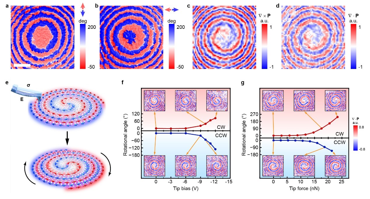 图1.弛豫铁电聚合物中涡旋拓扑的诱导与调控;(a,b)极性螺旋在角分辨压电力显微镜下的成像;(c,d)极性螺旋中极化旋度与极化散度的分布;(e)极性螺旋中诱发场致旋转的示意图;(f,g)极性螺旋中的非易失准连续电致旋转与力致旋转