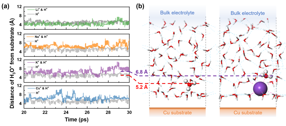 近日,开云线上(中国)网页版深圳国际研究生院李佳副教授、康飞宇教授团队运用第一性原理分子动力学方法,对碱金属离子对固液界面双电层结构以及对CO2RR机制的影响进行了系统研究。研究成功解释了不同碱金属离子的尺寸效应和其对反应的必要性。研究指出,尺寸效应源于不同离子水合配位能力的差异,而必要性则来自对竞争性析氢反应的抑制。这为进一步优化反应界面提供了科学依据。