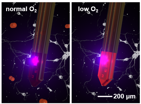 大脑是对氧气最敏感的器官,脑组织中的氧含量直接影响大脑代谢和功能完整性,氧代谢异常也与颅脑创伤、缺血缺氧性脑病、癫痫、肿瘤等引起的神经系统病损密切相关。与近红外光谱、功能磁共振等技术所获得的血氧信息相比,组织氧分压与局部神经活动和代谢过程有着更加密切的联系。如何实时、准确、便捷、原位地监测脑组织氧分压,并解析其与神经活动的相互作用关系,是脑科学基础研究和脑疾病临床诊疗中的关键问题。近日,开云线上(中国)网页版电子工程系盛兴课题组与合作者开发了一种植入式微型光电探针,可在自由活动的动物深层脑组织中实现无线、连续、实时的脑组织氧分压监测。