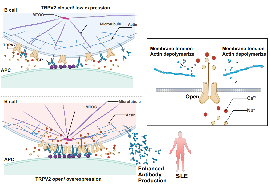 该研究发现TRPV2是在B淋巴细胞中唯一高水平表达的TRPV家族成员,且在IgG-BCR型记忆性B细胞中的表达量最高,对于B细胞的免疫活化和功能至关重要。在生理方面,揭示TRPV2的表达水平与流感特异性抗体生成水平呈显著正相关,并且在B细胞缺失TRPV2小鼠中抗原特异性抗体产生显著缺陷,揭示了TRPV2在免疫反应和抗体生成中的关键调控作用;此外,该研究还发现TRPV2在新生儿、老年人群中的表达水平普遍较低,为这类人群免疫力低下提供了新的解释,并为针对性地提升疫苗保护效果开辟了新途径。在病理层面,研究发现B细胞中的TRPV2表达量与系统性红斑狼疮病人(成年和儿童)的疾病发展呈显著正相关。针对病人队列的更精细的B细胞亚群分析揭示,在系统性红斑狼疮病人和健康志愿者中,TPRV2表达量在Naïve B细胞亚群没有差别,而只有在记忆性B细胞亚群呈现极大差别;更重要的是经过临床药物治疗(例如类固醇、环磷酰胺、硫唑嘌呤、霉酚酸酯、羟氯喹、甲氨蝶呤、钙调磷酸酶抑制剂等)后,TRPV2表达量显著下降,这一发现不仅为治疗自身免疫疾病开辟了新的靶点和治疗策略,更凸显了TRPV2作为自身免疫疾病进展和预后的生物标志物的潜力。在机制方面,发现TRPV2主要通过阳离子通道孔结构域及N端-ANK结构域调控B细胞的膜电势及细胞骨架重塑来调控B细胞的活化。综上,该研究不仅阐明了TRPV2在调控B细胞活化及功能中的关键作用,还为未来提高疫苗效能、开发新的治疗靶点和生物标志物来治疗自身免疫疾病奠定了坚实的科学基础。