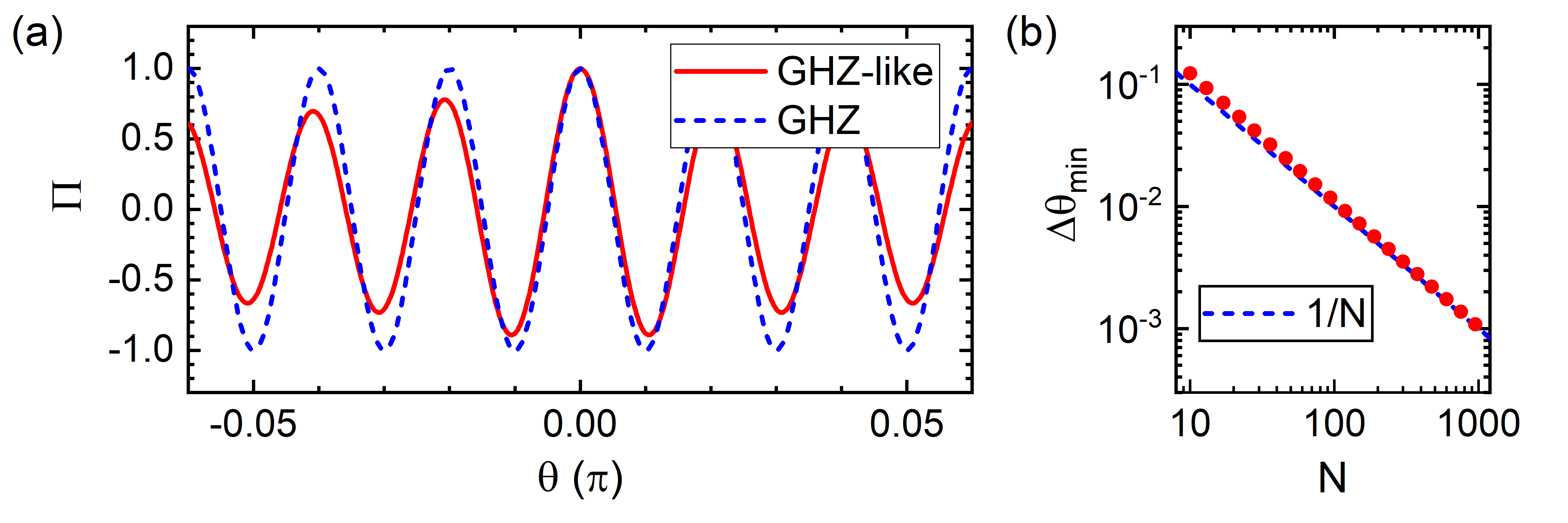 该方案制备产生的类GHZ态可用于实现量子精密测量。对系统进行宇称测量,所获得的测量精度与标准GHZ态的结果非常接近,可以达到海森堡极限的标度律(图3)。