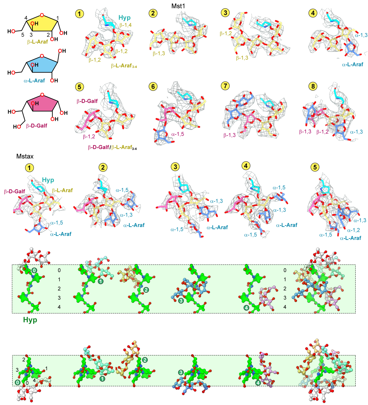 研究团队综合利用生物物理学、细胞生物学和生物信息学等学科方法对聚糖分子参与构建生物大分子架构的分子原理进行了阐释。已知植物和藻类具有独特的Hyp O-糖基化形式,其中的聚糖模块主要由阿拉伯糖和少量半乳糖组成。这种依赖Hyp O-糖基化的形式是植物和藻类行使正常生命活动的基础。此前并没有相关聚糖介导生物大分子架构组装的结构信息,该研究清楚地观测到超过1000个糖分子的密度(图2),是目前含有糖分子最多的复合物结构。通过多糖和蛋白的互作分析,研究揭示了阿拉伯聚糖在生物结构高级组装中的关键作用,从而为理解结构性聚糖分子在生命过程中的角色提供了重要线索,展现了现代结构生物学从结构确证工具到源头创新发现手段的角色转变。