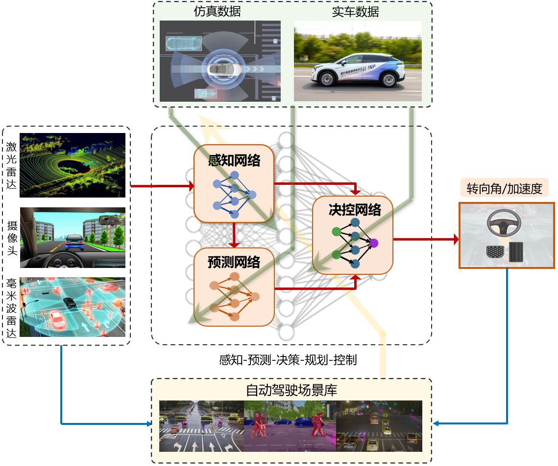 这一研究工作同时得到智行者、昇启科技两家高科技企业的全力支持,形成了校企之间紧密配合、通力协作的联合攻关团队。智行者团队主要工作在于环境感知模型的构建与预训练,昇启科技团队主要工作在于自动驾驶仿真平台的开发,三家单位共同完成了系统功能集成、性能评估迭代等后期任务。该研究获得国家“十四五”重点研发计划、国家自然科学基金以及开云线上(中国)网页版自主科研计划支持。