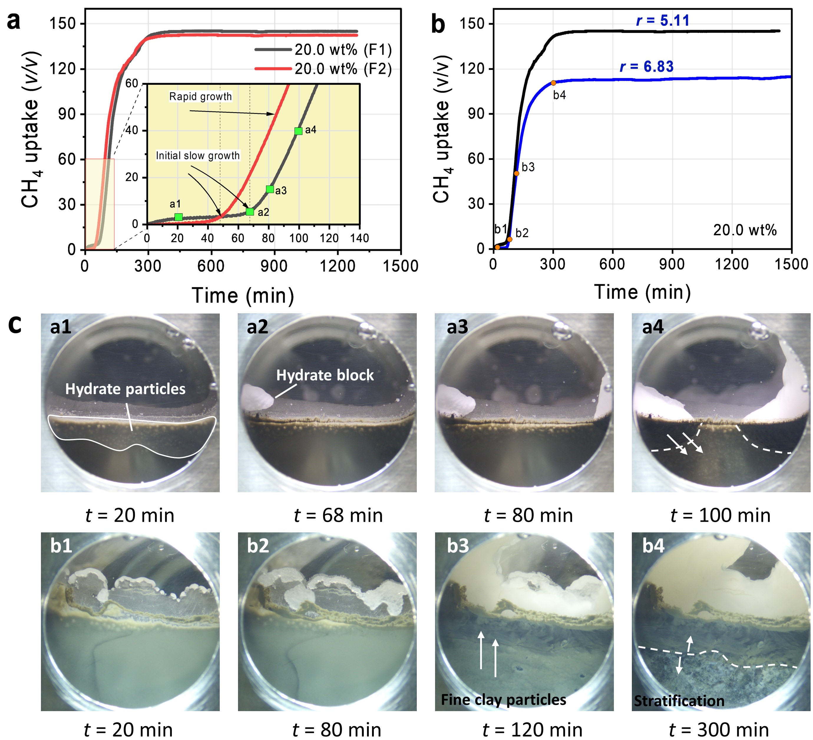 研究团队还发现,在甲烷水合物生成过程中,甲烷水合物的生成存在着初期缓慢生长阶段和后续快速生成阶段两阶段生长模式,其特征是气体消耗量在经历初始缓慢生长之后快速增长,在300分钟左右生成结束。研究通过高速摄像机观察到沉积物悬浮液中甲烷水合物的形态演变:其生成最初发生在气-液界面,随后扩展到液相中,生成大量的水合物颗粒,并伴随爬壁现象,导致反应器窗口上出现水合物团块。研究观察到水合物向沉积物内部生长过程,存在显著的生长前缘,并在气相中观察到大块白色水合物固体。