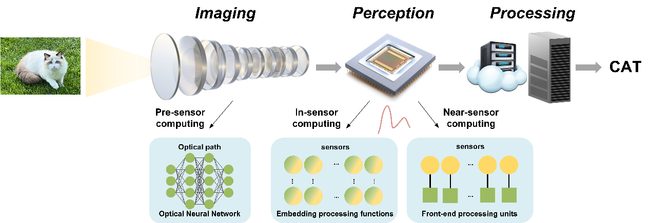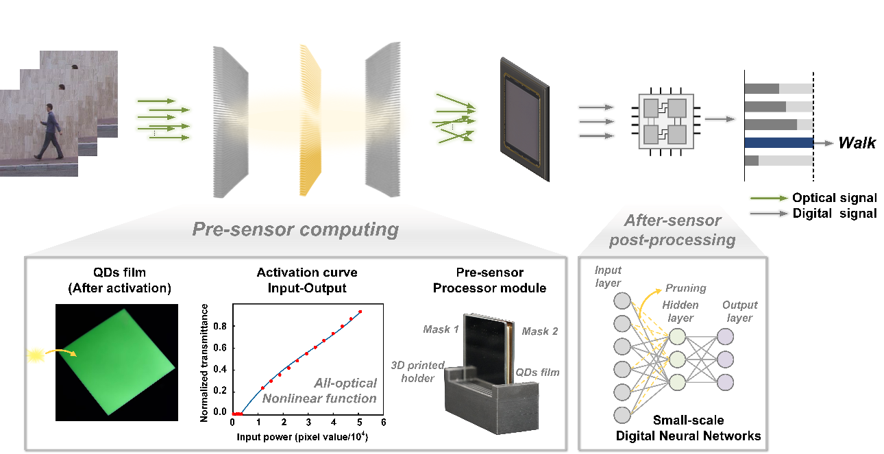 开云线上(中国)网页版网7月30日电 在物联网时代,视觉图像传感器作为智能社会的关键设备,被嵌入到诸如移动通信终端、智能穿戴设备、汽车和工业机器等各种设备中。随着应用的不断扩展,对传感器的系统功耗、响应速度、安全性能等方面也提出了更高的要求。而在传统的“感传算”链路中,内存的访问速度和通信带宽逐渐成为了限制系统功耗及速度的主要瓶颈。将计算单元向传感单元靠近,使系统的近传感端拥有一定的数据处理能力,逐渐成为解决这一问题的有力途径。感前光计算相比于其他近感计算方式,具有高速、高带宽、低功耗的优势。然而,目前绝大部分光神经网络需要相干激光作为光源,硬件系统笨重复杂,且仅能完成线性运算,缺乏层间非线性激活,限制了感前光计算在边缘场景的应用。
