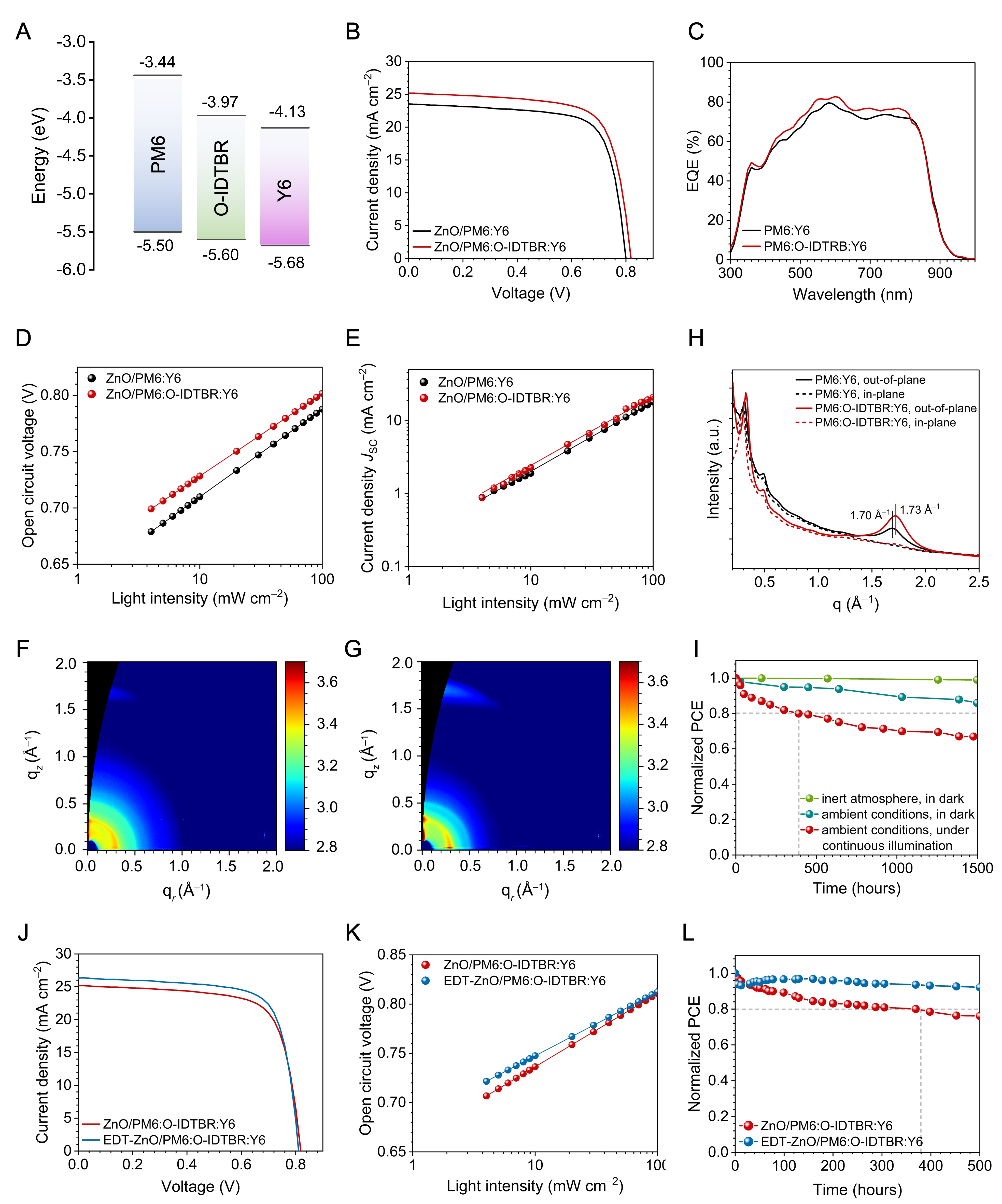 超柔性有机光伏器件采用了PM6:O-IDTBR:Y6三元共混体系(图2)。与常见的二元体系相比,三元体系拓宽了光吸收范围,以能量级联通道提升了供受体界面激子解离效率,具有更小π-π堆积距离。使用EDT钝化ZnO电子传输层,进一步提升了光照稳定性。最终实现了单个器件光电转换效率(PCE)高达16.18%,黑暗惰性环境中逾1500小时的长寿命,以及50 mW cm-2光强下连续照明500小时后PCE保持初始值92%以上的高性能。