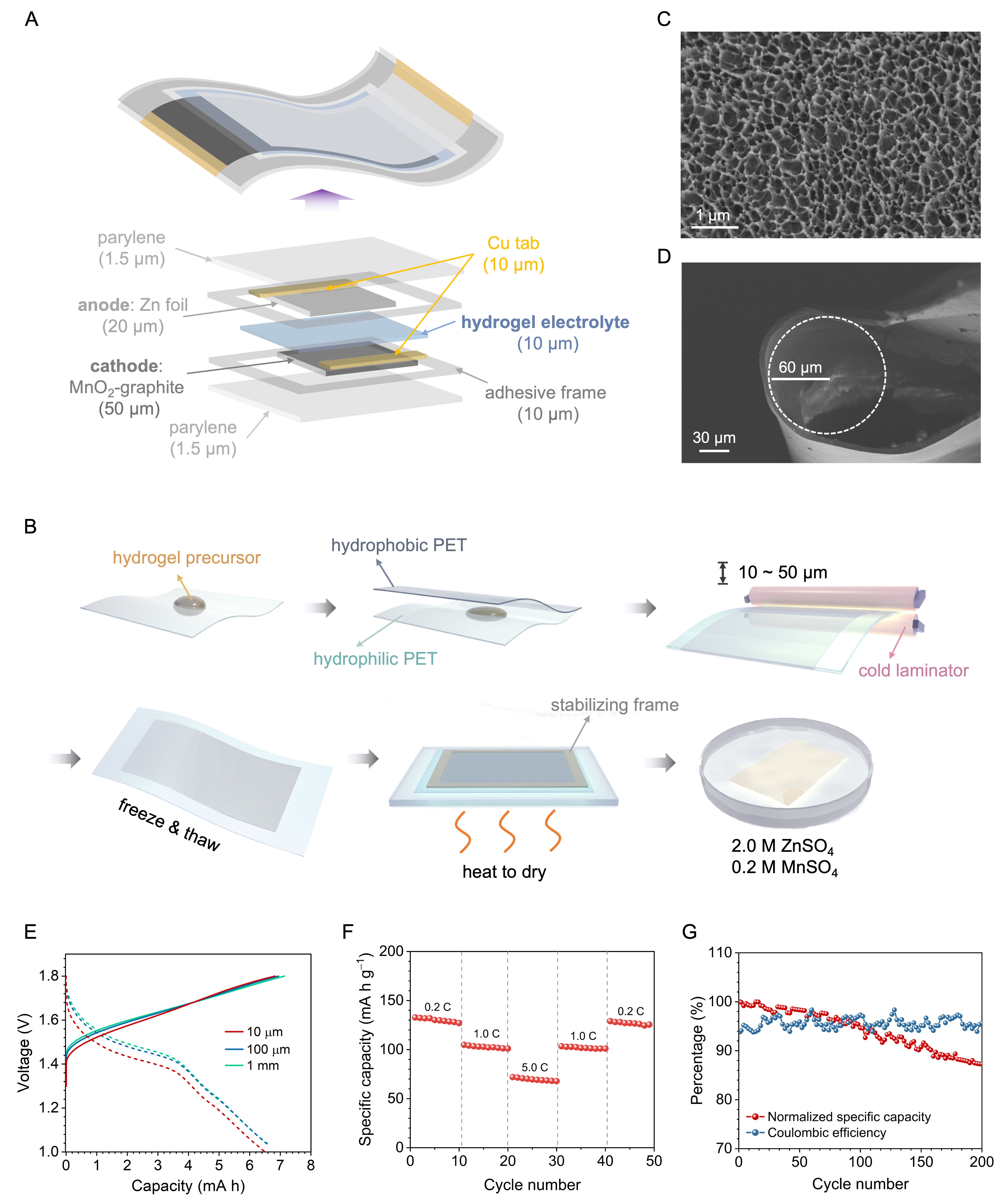 超薄锌离子电池由锌阴极、二氧化锰-石墨阳极和超薄水凝胶电解质组成(图4)。团队创新开发了10微米厚度的超薄聚乙烯醇-氧化石墨烯(PVA-GO)水凝胶,具有优越的机械顺应性,且超薄特性弥补了微小容量损失。基于10μm超薄水凝胶电解质构建的超薄ZIB,总厚度仅为85μm,具备良好的倍率性能和循环稳定性。