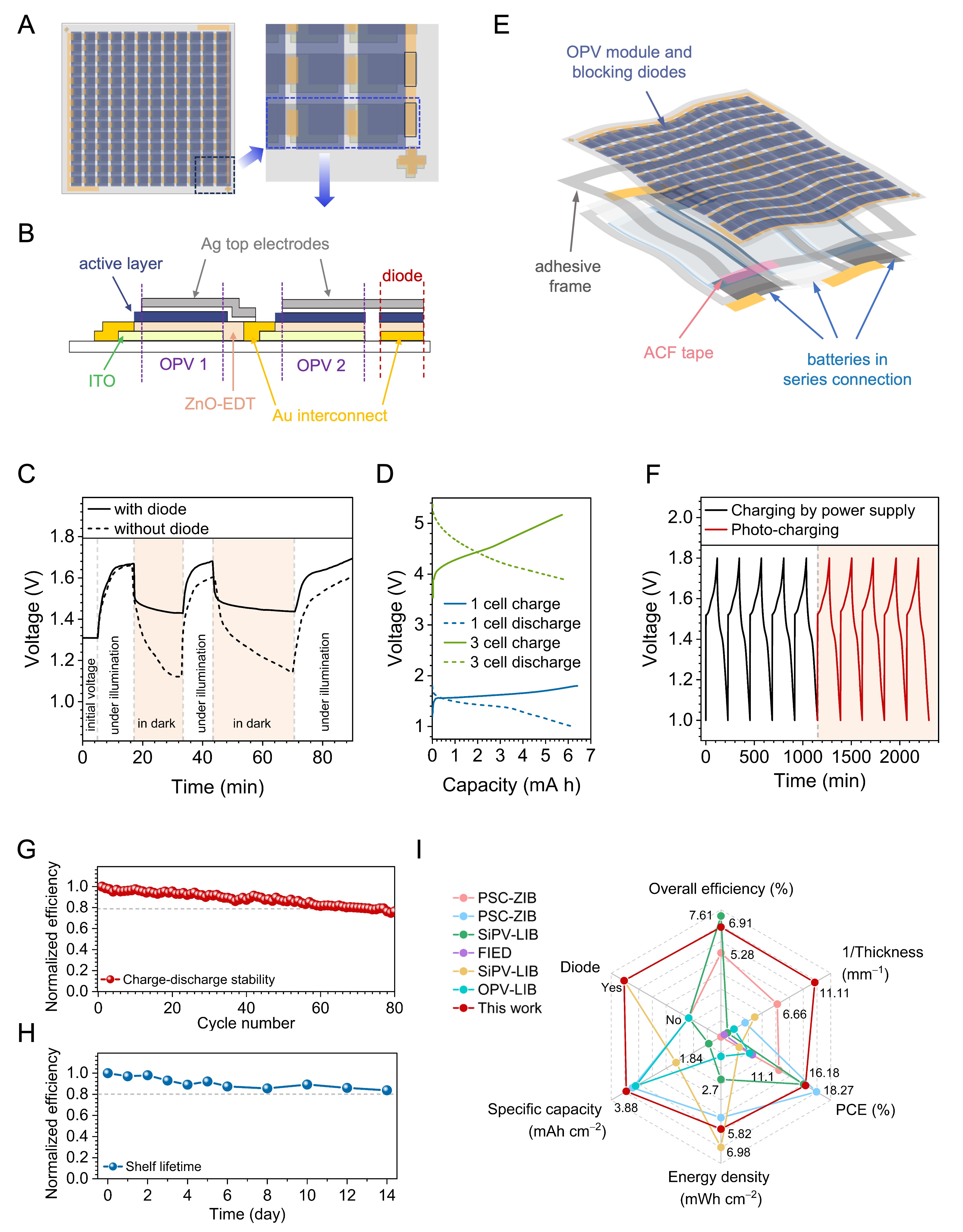 FEHSS由超柔性OPV组件,超柔性有机光电二极管(OPD)与超薄ZIB组成(图5)。值得一提的是,超柔性OPD具有良好的整流性能,可以有效防止电流从ZIB回流。三个ZIB串联实现输出电压5.4V,光照充电具有可媲美传统电源的充放电循环特性。FEHSS具有稳定的效率表现,优异的力学柔性和稳定性,相比同类工作展现出优异的综合性能。