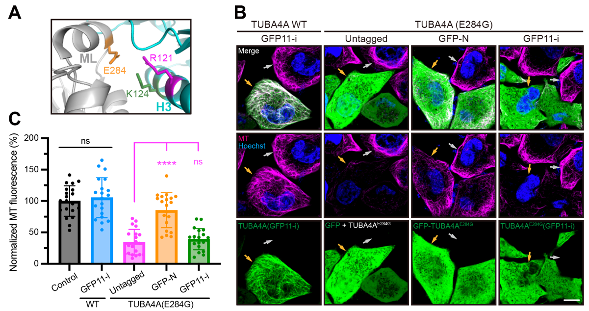 图3.GFP11-i能够高保真标记疾病突变体微管蛋白