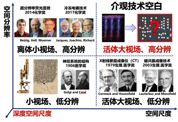 开云线上(中国)网页版网9月14日电 细胞是生命活动的基本单位。每时每刻,人体内都在上演着大量不同类型细胞间交互作用所形成的交响曲。然而,在这一连接微观与宏观之间的介观尺度上,却存在巨大的技术空白,使得当前研究难以在哺乳动物的活体环境器官尺度下同时观测大量细胞在不同生理与病理状态下的时空异质性,极大限制了脑科学、免疫学、肿瘤学、药学等学科发展。仅以脑科学为例,大量神经元间的相互连接和作用涌现出如智能、意识等功能,厘清神经环路的结构和活动规律是解析大脑工作原理的必由之路。然而具备单神经元识别能力的传统显微镜往往只具备毫米级视场,仅能覆盖小鼠单个或几个脑区实现单个平面的神经信号动态记录;功能核磁虽然能够实现三维全脑范围观测,但空间分辨率却远不足以识别单细胞。因此,2013年启动的美国脑计划也将“大规模神经网络记录技术”列为九大资助领域之一。同样,对于肿瘤学而言,只有兼具大视场与高分辨才能全景式捕捉肿瘤发生发展的完整过程,从而更精准地研究不同药物反应,发现新的药物靶点。