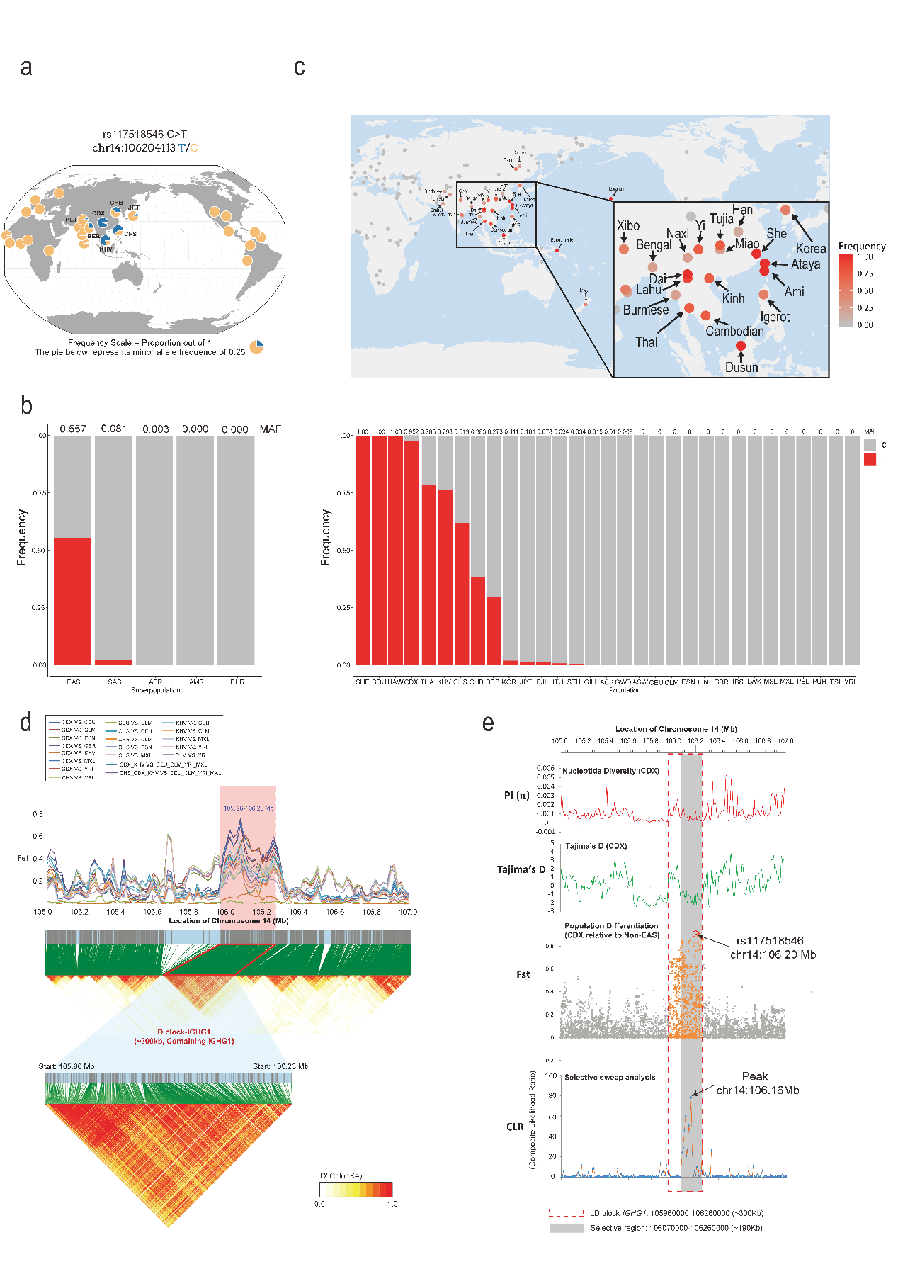 形成鲜明对照且有趣的是,这些人群主体在地理位置上也展现了集中在东南亚中南半岛地区及其周边人群的趋势,但是IgG1-G396R在同为东亚国家的日本、韩国人群中比例明显低于上述人群,并且在巴布亚新几内亚和澳大利亚土著个体中并未出现。对群体遗传学数据的分析发现IgG1-G396R在上述地区的人群中位于一个约300 kb的连锁不平衡区块上,而且具有较高的固定指数(Fst);进一步的基因连锁分析发现在300 kb LD区块中IgG1-G396R位点所在的更为突出的190 kb LD区块进一步展现了较低的核苷酸多样性、Tajima D的负值,在选择性清除分析中展现高被选择性,表明该位点在进化上受到正选择压力(如图)。