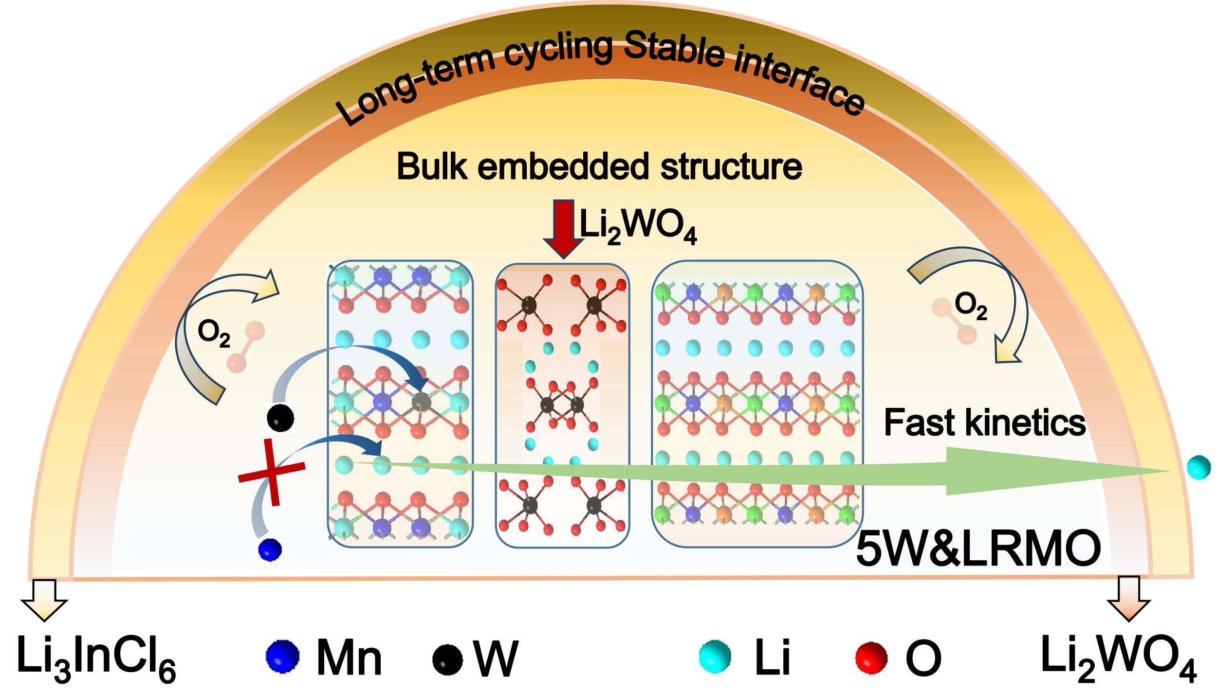 该研究提出一步法合成策略,优化富锂锰基正极材料体相/表界面结构,创制了具有体相嵌入结构、W掺杂和Li2WO4表面包覆的富锂锰基正极材料(5W&LRMO)。该结构增强了富锂锰基正极材料的体相结构稳定性,改善了Li+/e−的传输动力学,显著提升过渡金属阳离子、阴离子氧的氧化还原活性,实现了阴离子氧氧化还原反应在充放电过程中的电荷补偿,从而促进了富锂锰基正极材料表面氧离子氧化还原反应的可逆性,稳定了高电压固-固界面。优化的界面确保高电压区间充放电稳定性,并在长循环周期内保持高效的Li+/e−转移动力学,从而提高了复合正极材料中活性物质的利用率。