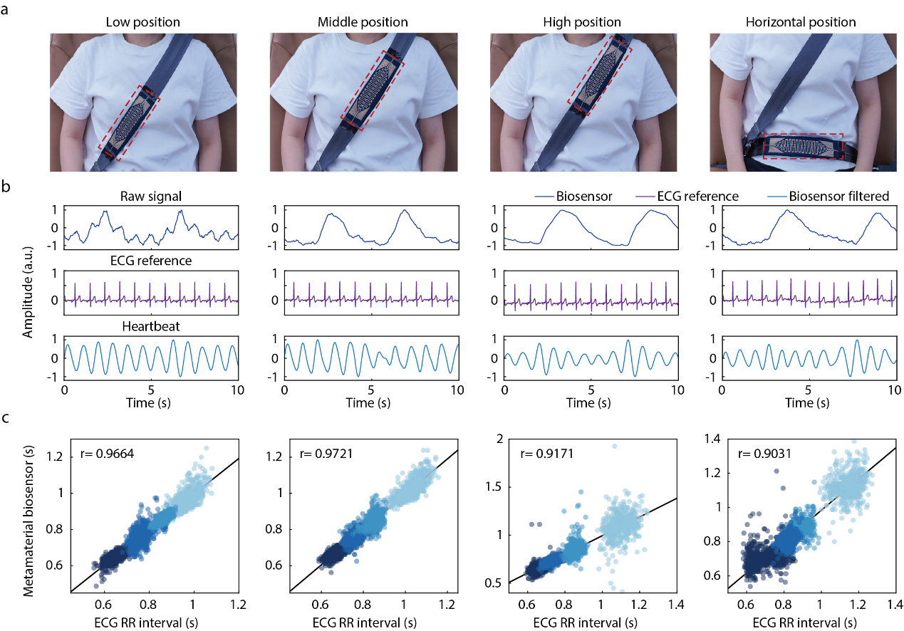 同时,超表面生物传感器能被布置在安全带的多个位置,包括肩和腰部,且不受衣物材料和厚度的影响(图2)。各处传感器的表征数据均显示与参考信号优秀的一致性,相关性均高于0.9,心率标准差错误低于3 bpm。