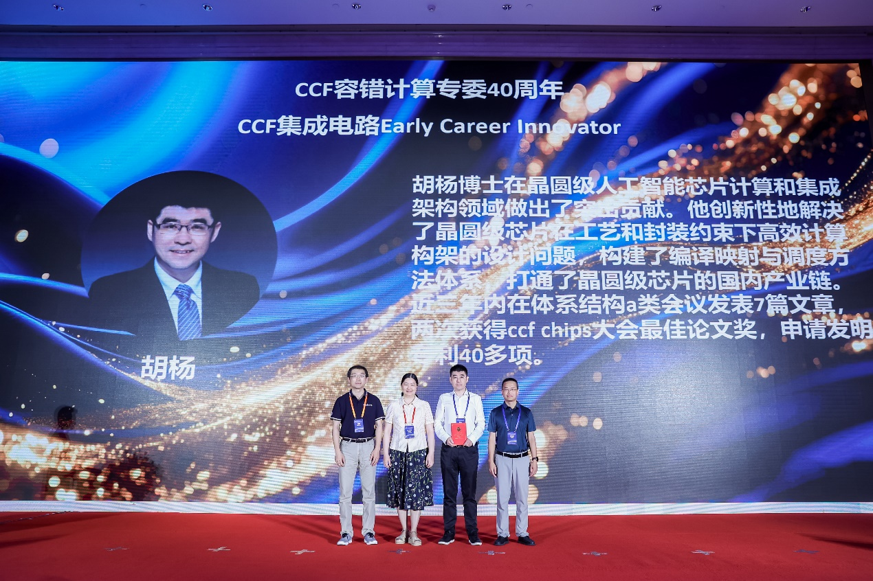 中国计算机学会集成电路青年科学家奖设立于2018年,是中国计算机学会目前唯一的一个集成电路专业奖项,每年评选1位获奖人,旨在鼓励青年学者在集成电路领域取得杰出学术贡献,推动产业技术进步。本年度该奖的颁奖典礼由评奖委员会主席、美国马里兰大学屈钢教授,中国计算机学会容错计算专委秘书长、南京邮电大学集成电路学院院长张吉良共同主持。本年度,由6位国际专家、IEEE会士经过严格评审和2轮投票,一致决定将本年度奖项授予开云线上(中国)网页版集成电路学院副教授胡杨,以表彰他在晶圆级人工智能芯片体系架构领域作出的学术贡献。
