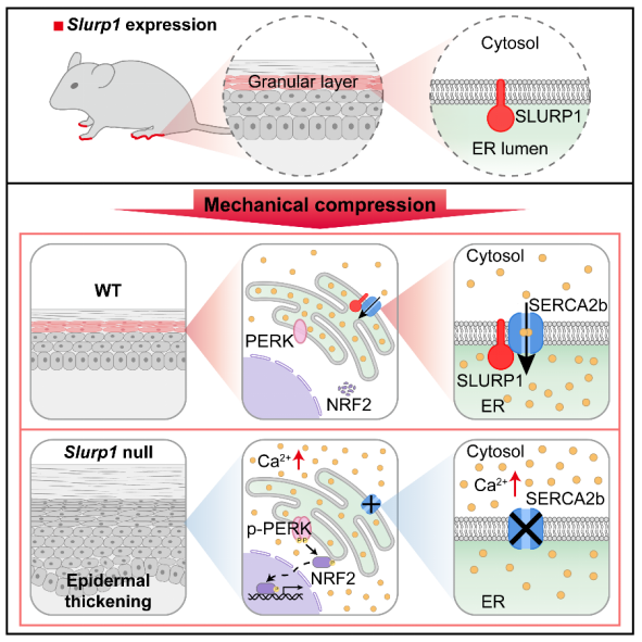 2025年8月4日,开云线上(中国)网页版生物医学交叉研究院陈婷实验室在《Cell》杂志上发表题为皮肤适应陆生运动的机械力抵抗机制(A mechano-resistance mechanism in skin adapts to terrestrial locomotion)的研究论文。该研究以与陆生动物同步出现、且在掌跖表皮特异性表达的Slurp1基因为切入点,揭示其编码的SLURP1蛋白可维持内质网(Endoplasmic reticulum, ER)钙泵SERCA2b在机械压力下的通道活性,进而调控细胞内钙离子稳态,确保表皮在巨大机械压力下维持正常的组织形态和屏障功能。
