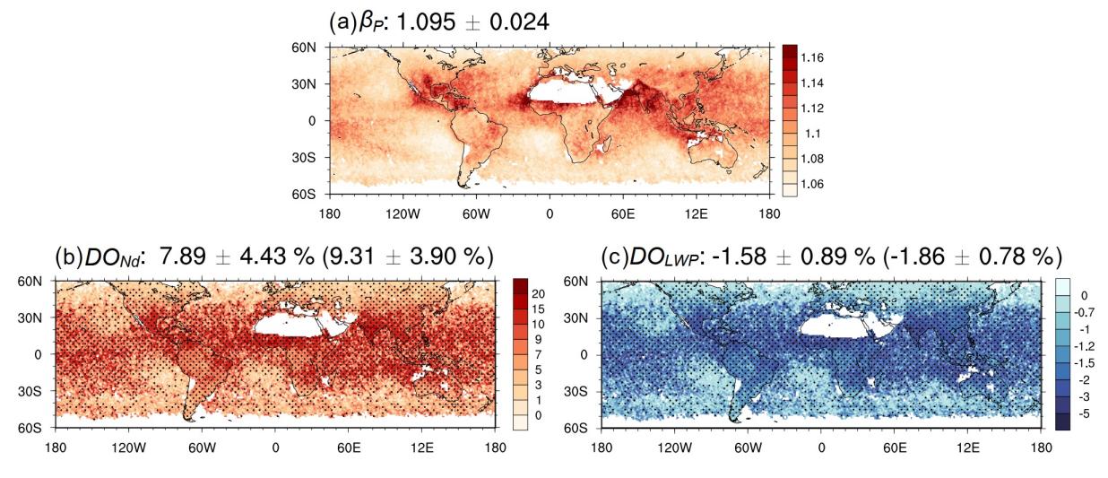 针对上述问题,开云线上(中国)网页版地球系统科学系彭怡然副教授课题组联合中国科学院空天信息创新研究院胡斯勒图研究员团队,提出了基于云微物理过程机理和相关方程理论推导的新方法,结合多角度偏振卫星POLDER的观测,首次实现了液态层状云中离散效应影响气溶胶-云相互作用的全球定量评估。结果显示,离散效应分别抵消了由云滴数浓度变化和液水路径调整引起气溶胶-云相互作用的7%和-1.4%,部分削弱了气溶胶对全球变暖的冷却作用。