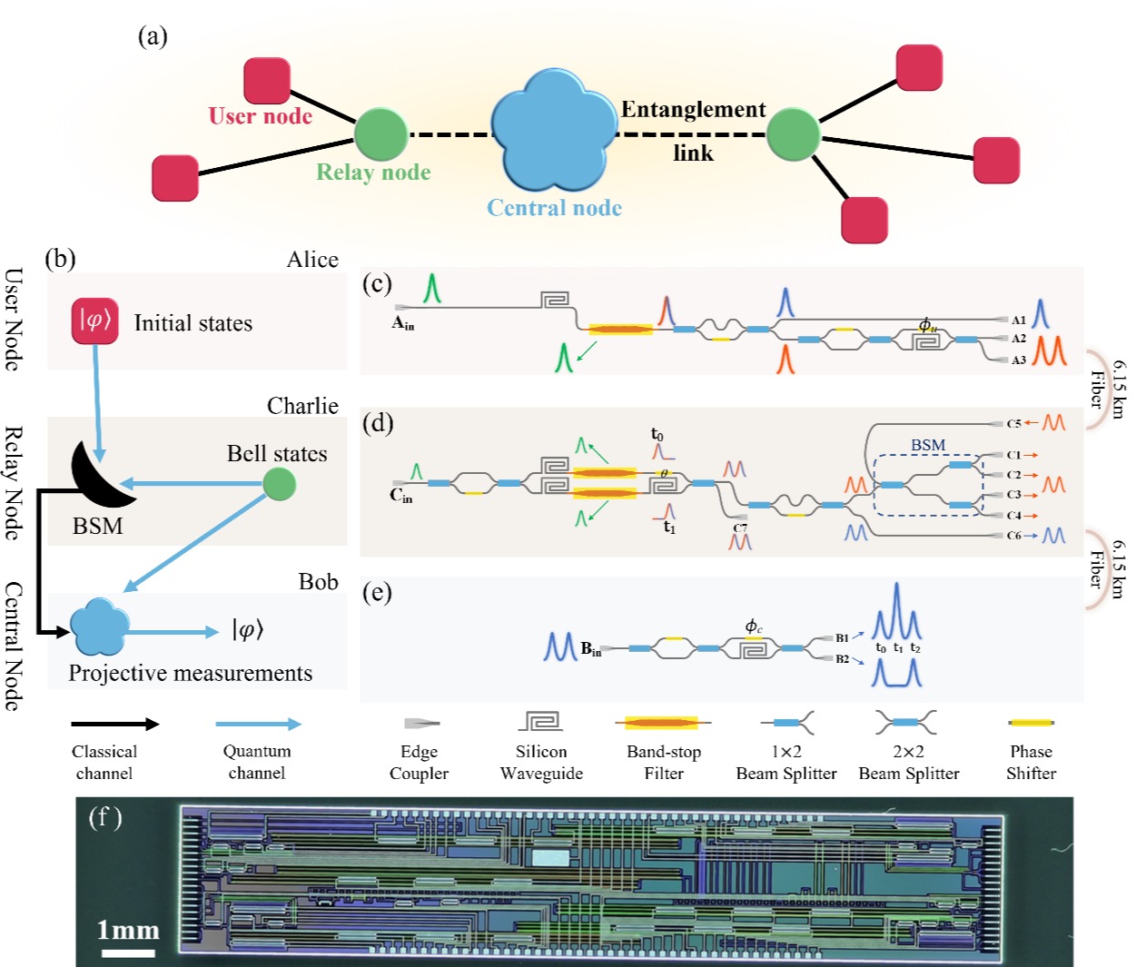 (a)星形拓扑量子网络中量子隐形传态应用场景(b)用户节点、中继节点和中心节点间的光子量子隐形传态功能(c)-(e)用户、中继和中心节点的硅光量子芯片片上光路设计(f)制备出的硅光子芯片的照片,集成了三个节点的片上光路