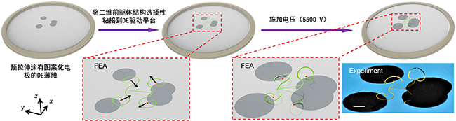 图1:基于介电弹性体驱动平台的电控三维组装过程示意图,比例尺为8 mm 。