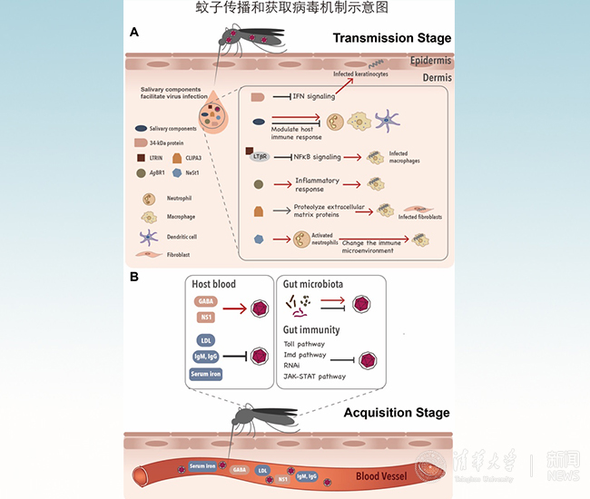 图1. 蚊媒病毒传播循环的分子机制。(A)病毒传播过程分子机制;(B)病毒获取过程分子机制
